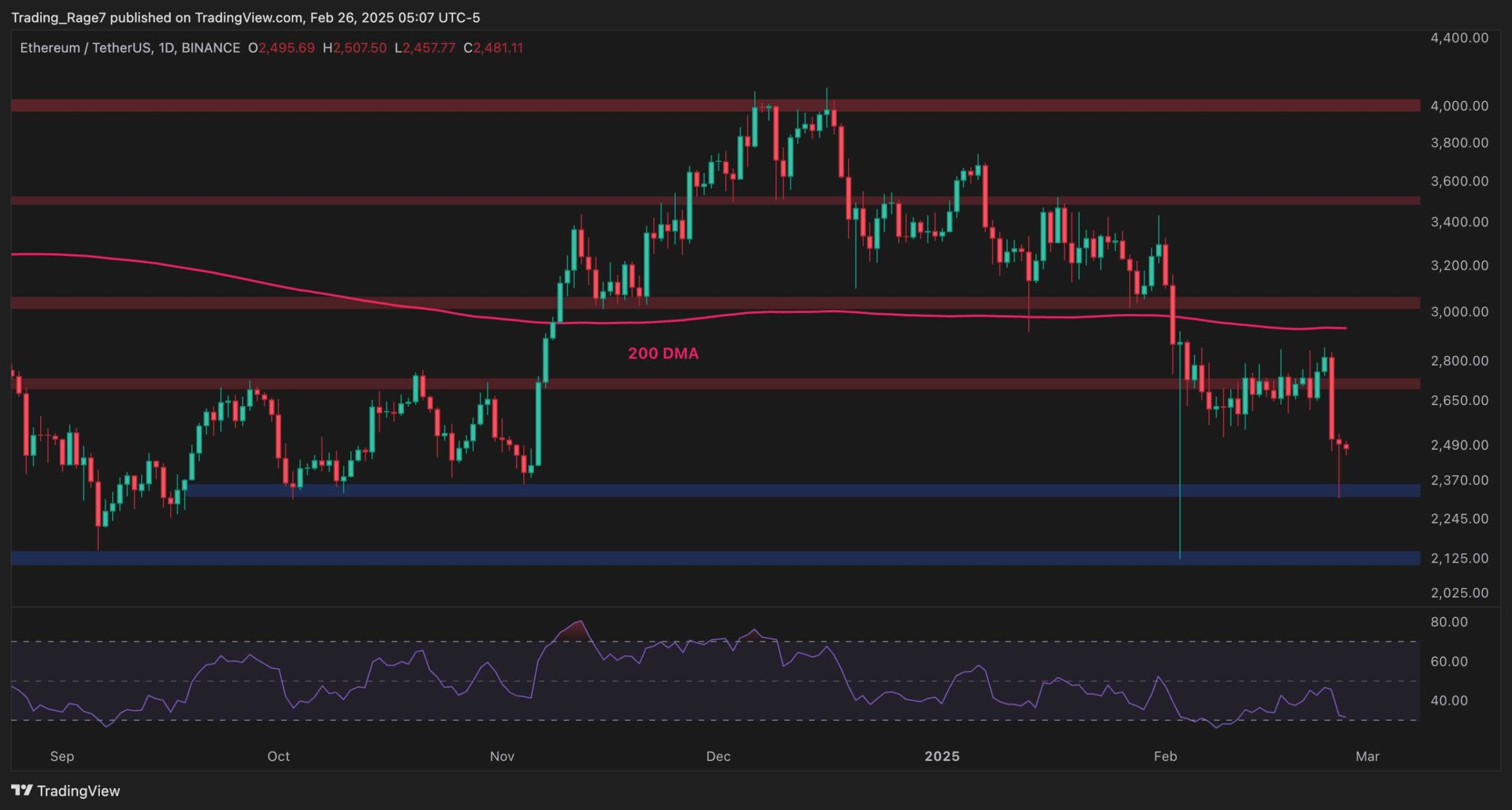 Yesterday, the altcoin rebounded from the $2,400 support zone, but it’s still likely to drop back toward it as the RSI is still showing a clear bearish momentum signal. If the $2,400 level is lost, things could get much worse, as a drop toward the $2,000 mark and even lower could be expected.