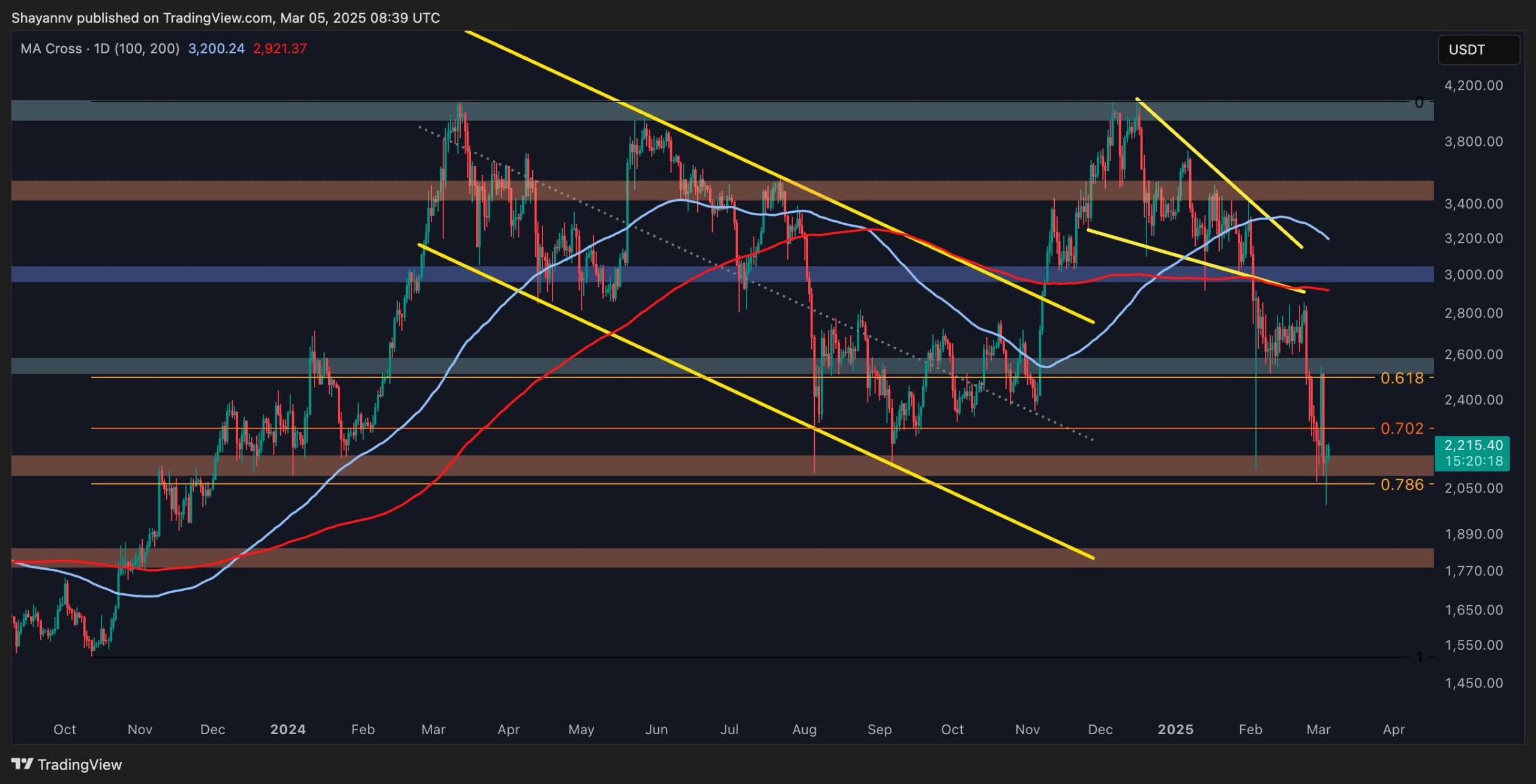 Ethereum has recently faced a sharp decline, plunging nearly 30% to reach the critical $2K support level. This drop followed a rejection at the 200-day moving average near $2.9K and was aggravated by market uncertainty triggered by President Trump’s tariff war announcement. The fear-driven sell-off has left Ethereum in a volatile state, but the $2K region has provided significant support, aligning with key ICT OTE levels.