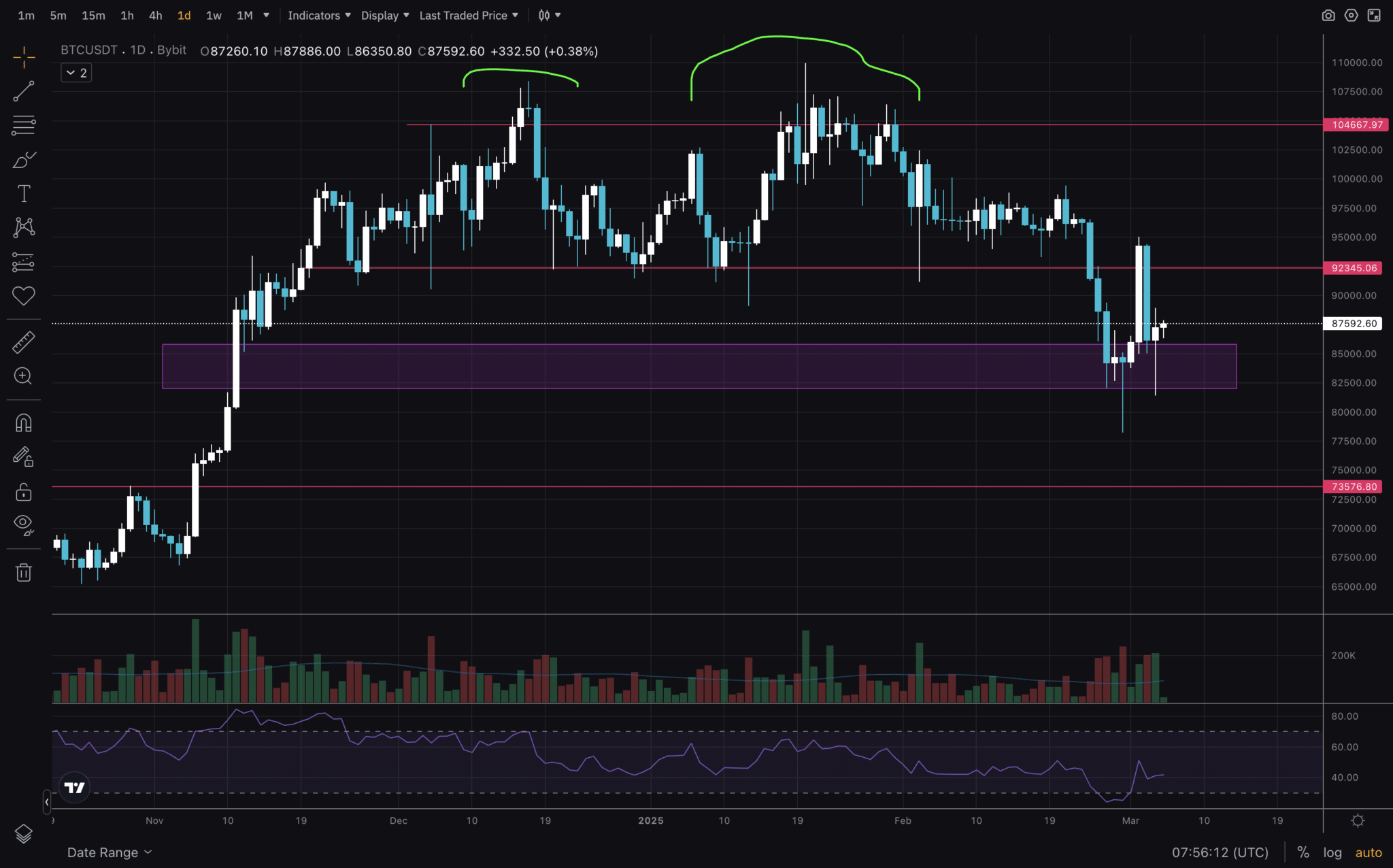 Next, we’re looking at the 12H timeframe for BTC Price Analysis 2025, early March. On the top image, I’ve identified multiple lower highs and lower lows – typical for a down trend. The last low seems to be higher than the previous. It’s good to keep an eye if it holds. Or will we see a lower low in the upcoming days? A great sign will be if we see a higher high form. That, and another higher low indicates a shift in trend.
