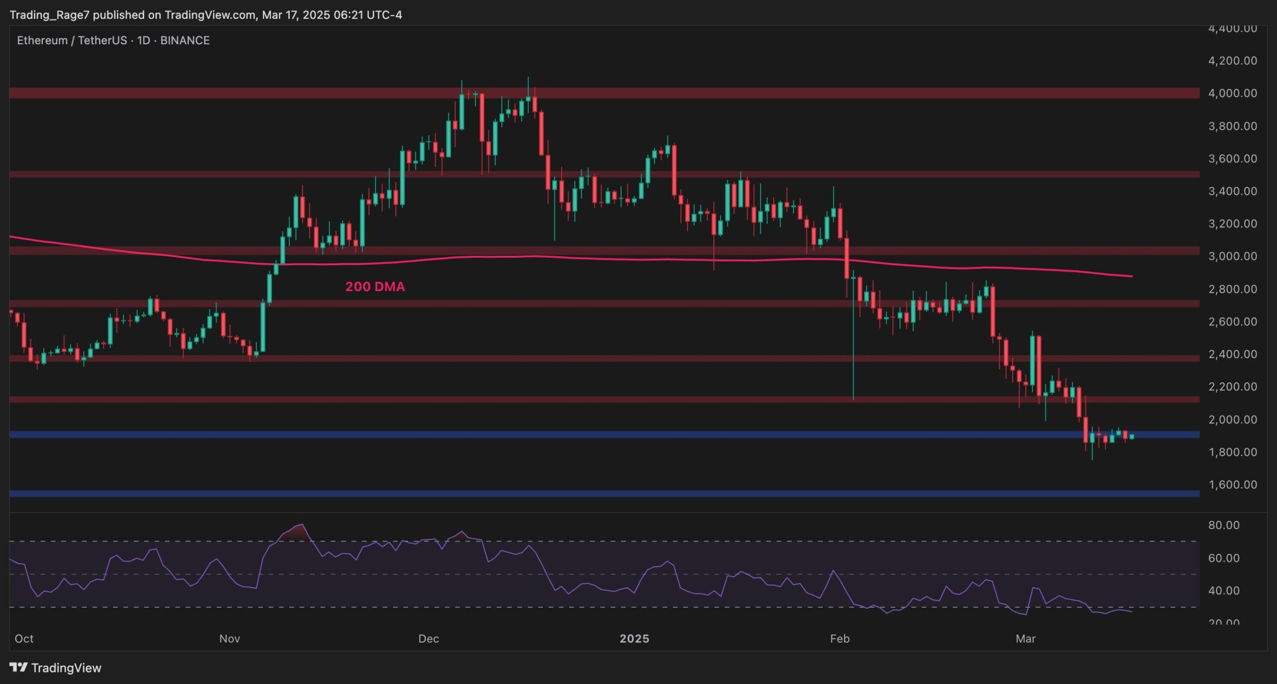 Meanwhile, the RSI is in the oversold territory, which suggests a short-term bounce could occur. A decisive break above $2,000 with strong volume could shift momentum toward $2,200, but failure to do so would likely confirm continued weakness in the short term.