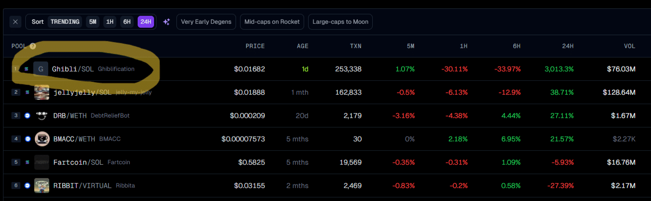 And it appears the market has already chosen a winner amongst the swathe of new Studio Ghibli crypto, with the launch of ‘GHIBLI’ on Solana breaking out to take the top spot on GeckoTerminal.