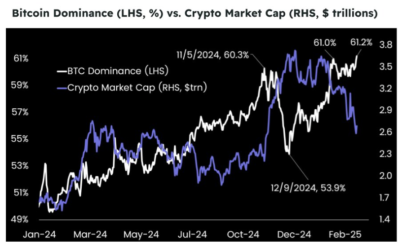 Tuy nhiên, nếu xét về sức mạnh tương đối, Bitcoin vẫn đang giữ vị trí ngôi sao sáng nhất! Tỷ lệ thống trị của BTC đã tăng lên hơn 61%, ngay cả khi tổng vốn hóa thị trường crypto giảm mạnh. Điều này cho thấy dòng vốn đang chảy từ các altcoin rủi ro hơn sang Bitcoin trong bối cảnh bất ổn vĩ mô gia tăng. Ethereum, Solana và các altcoin khác đã giảm từ 35-50% từ các đỉnh chu kỳ của chúng, củng cố vai trò “tài sản dự trữ” của Bitcoin trong thế giới kỹ thuật số.
