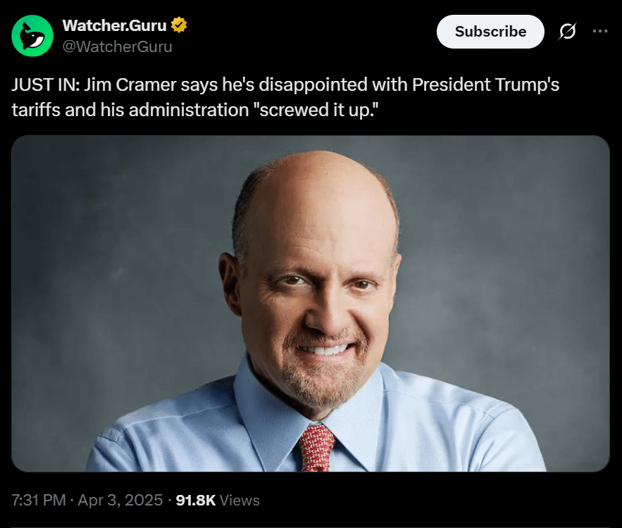 Obviously, people saying the Trump tariffs are bad have never gotten anything wrong before… right, right?! The truth is, Cramer isn’t mad that Trump went ahead with the tariffs; he’s in favor of that. He’s mad that Trump didn’t have reciprocal tariffs. In other words…