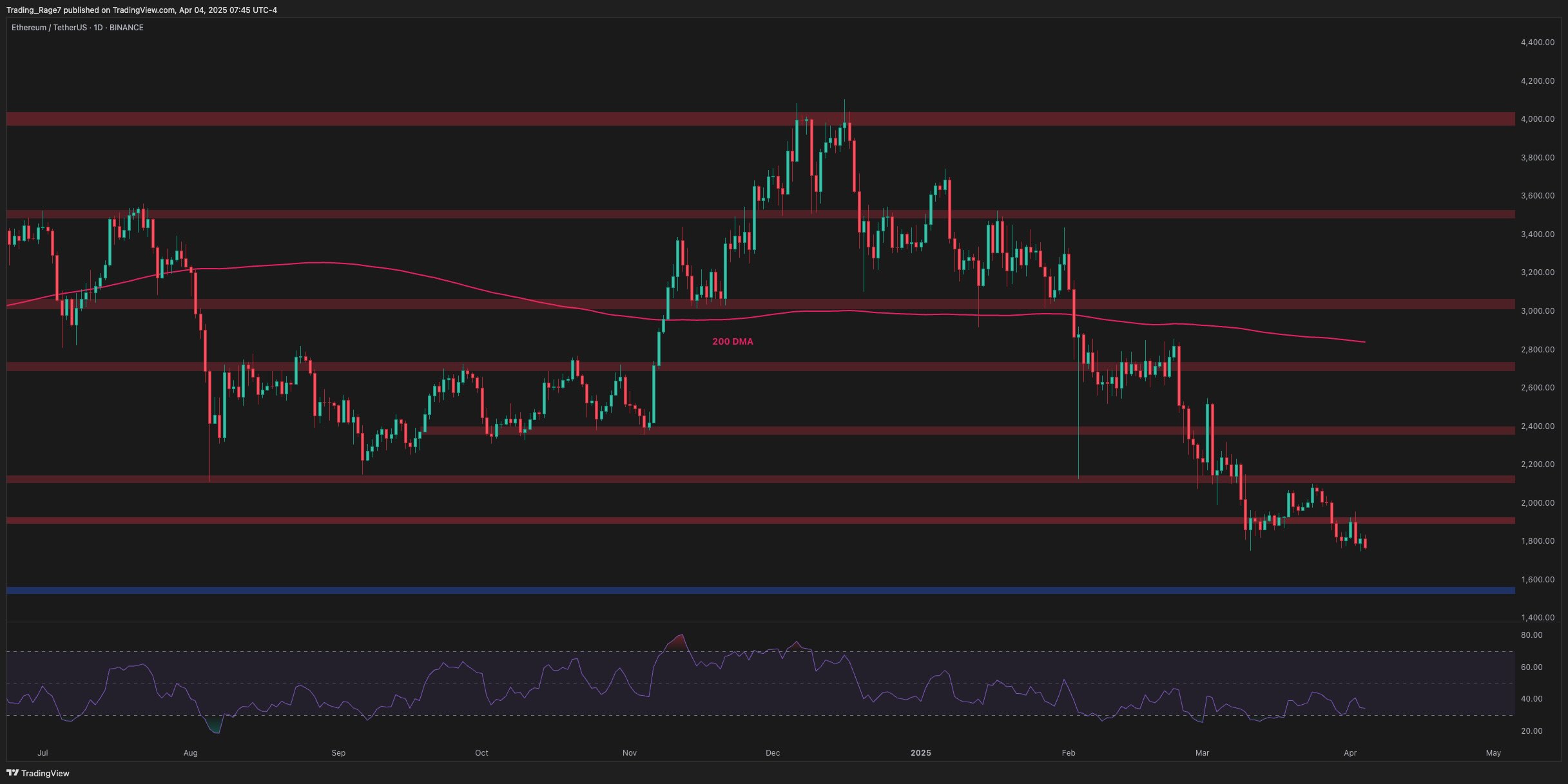 The 200-day moving average, currently positioned above $2,800, underscores the broader bearish bias, while RSI lingers in oversold territory, suggesting that downside momentum is still present but potentially weakening. The next strong support lies near the $1,550 region, which is likely going to be touched soon.