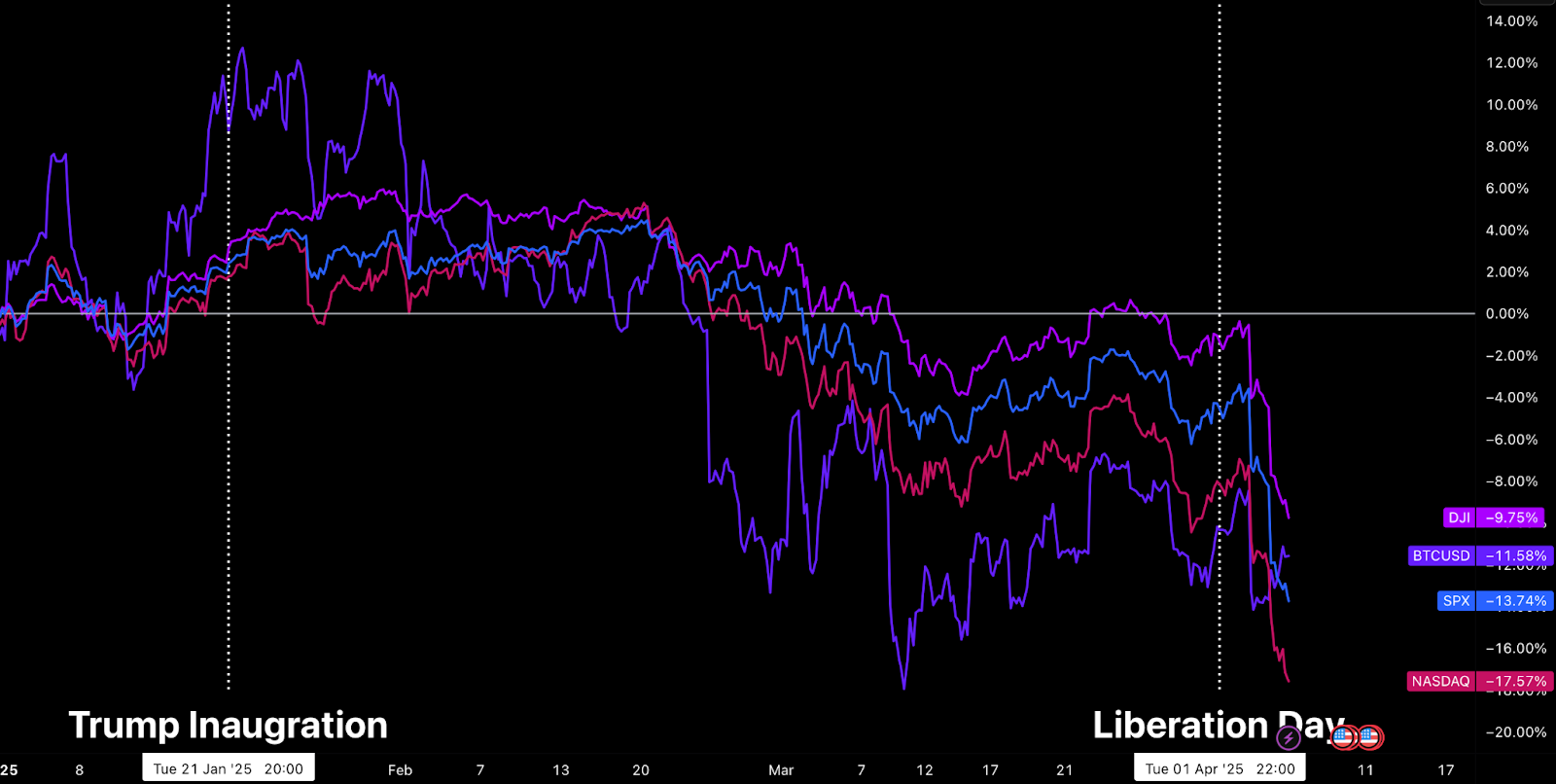 SPX, NASDAQ, Dow Jones Industrial Average and Bitcoin Percentage Returns Since 2025 Yearly Open
