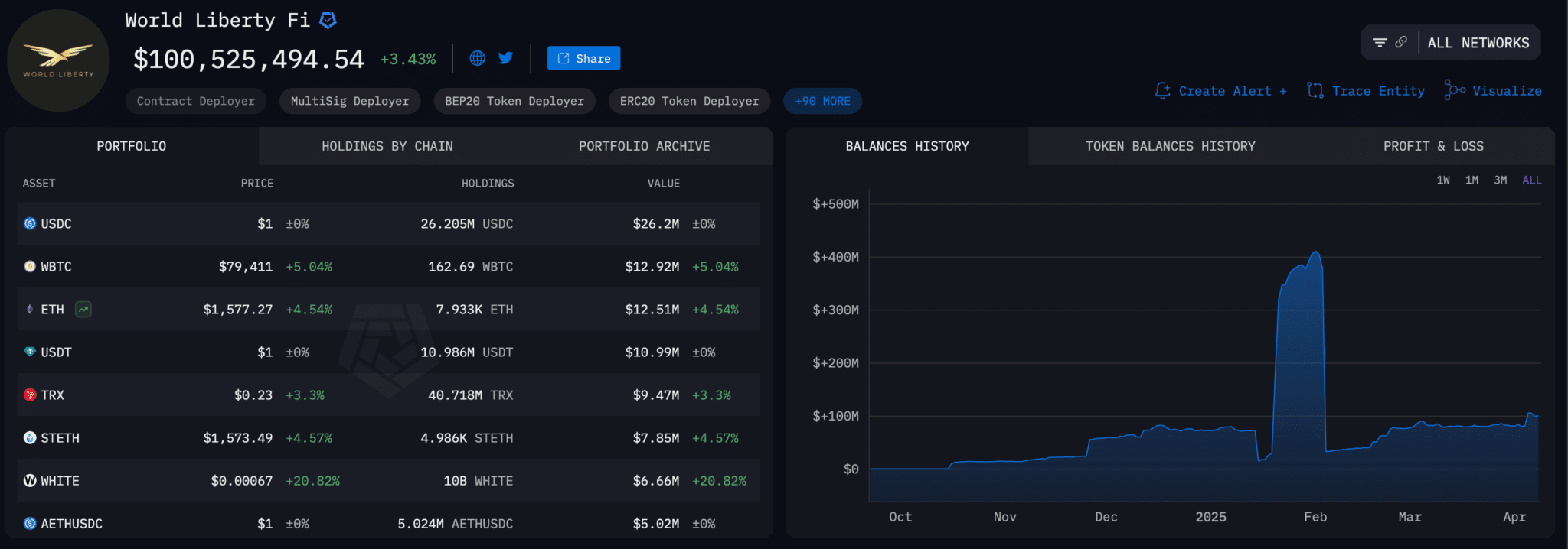 Per the Arkham Intelligence dashboard for World Liberty Financial, the firm currently holds over $100 million in digital assets. Its portfolio is mostly made up of USDC, Wrapped BTC, ETH, USDT and TRX.