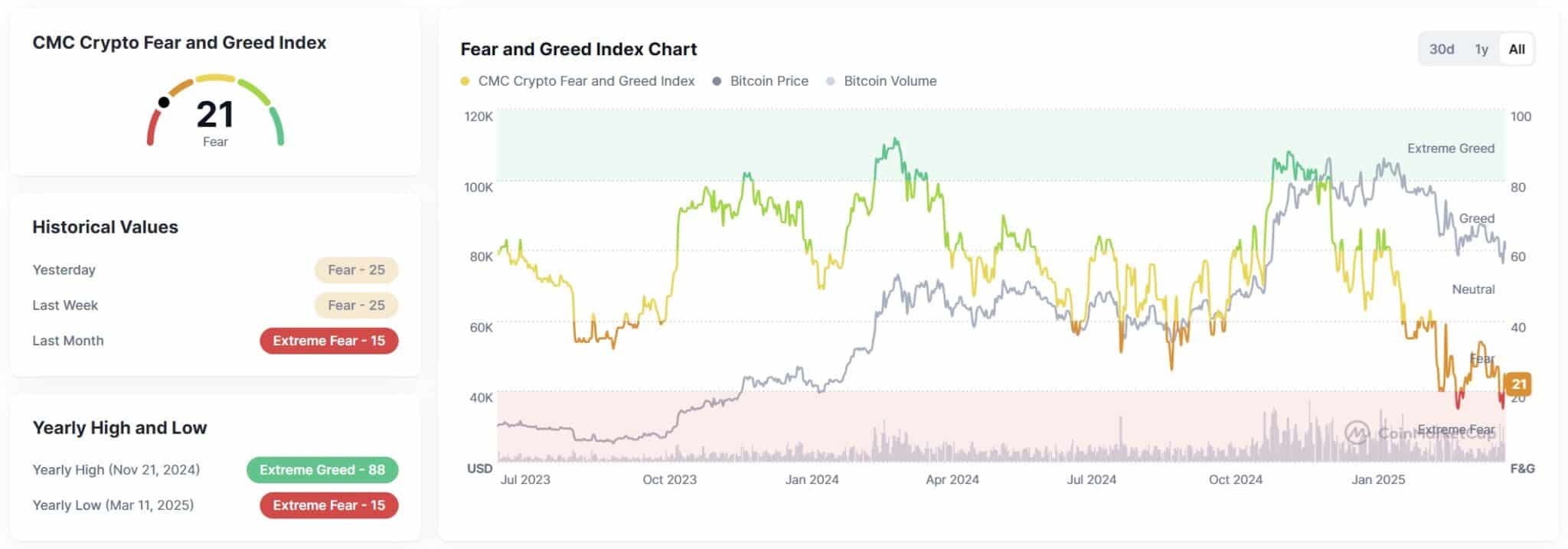 And then there’s sentiment, always the X factor in crypto. The CoinMarketCap Fear & Greed Index has been sitting in “Fear” and “Extreme Fear” territory for weeks. The general investor mood hasn’t caught up, even with accumulation happening behind the scenes.