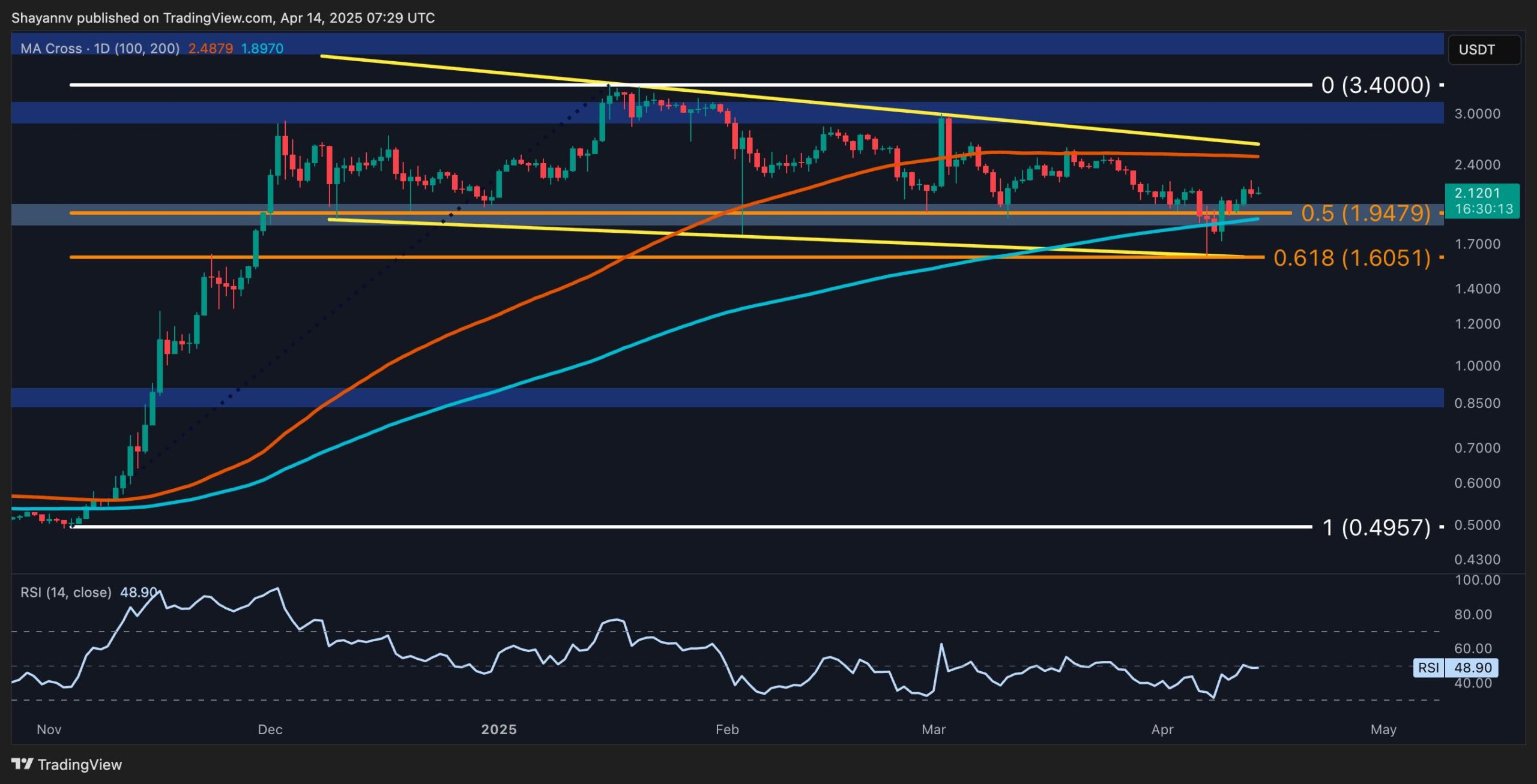 Despite the rebound, XRP remains trapped between the 100-day and 200-day moving averages, pointing toward a consolidation phase. Notably, the 100-day MA at $2.5 coincides with the upper boundary of a prolonged descending wedge pattern. A breakout above this level could confirm a bullish shift and initiate a fresh upward leg toward higher resistance zones.