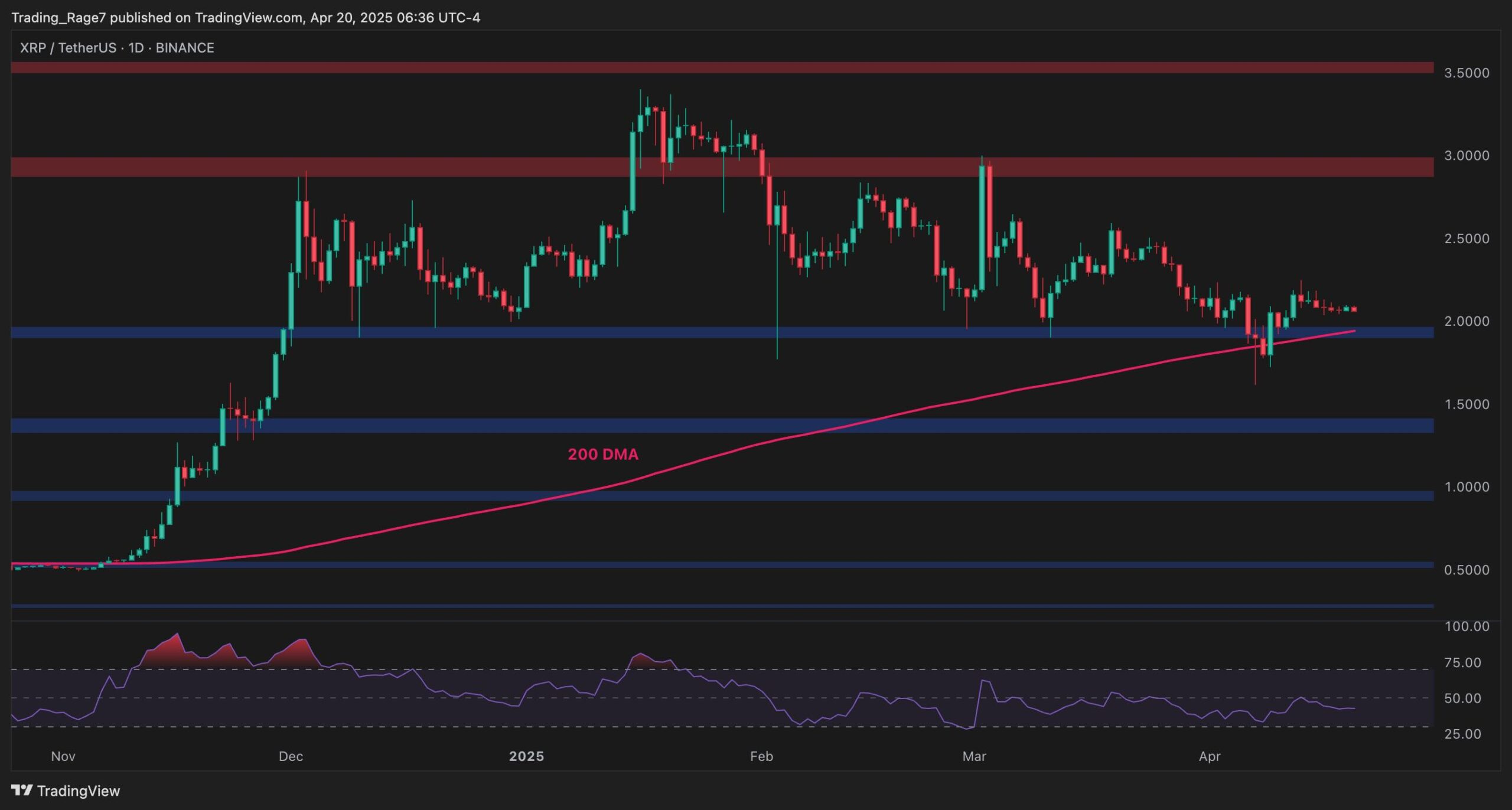 XRP is holding just above the $2.00 support zone and the 200-day moving average, located around the same price mark.
