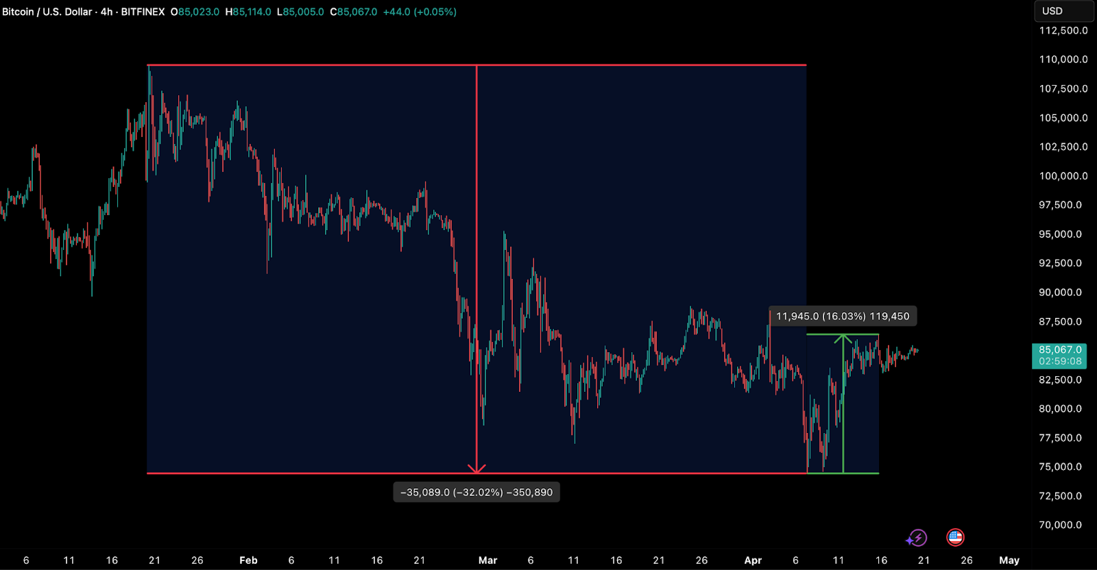 Bitcoin đã cho thấy khả năng phục hồi đáng nể giữa một trong những giai đoạn bất ổn kinh tế vĩ mô “dữ dội” nhất trong những năm gần đây. Bất chấp mức giảm 32% từ đỉnh tháng Giêng, BTC vẫn đi đúng quỹ đạo của các đợt thoái lui giữa chu kỳ điển hình trong các thị trường tăng giá trước đây. Điều đáng chú ý là, trong khi chứng khoán và trái phiếu kho bạc Mỹ trải qua biến động cực độ – thể hiện qua việc chỉ số VIX tăng vọt lên trên 40 lần đầu tiên sau hơn năm năm – Bitcoin đã phục hồi hơn 16% từ mức đáy, vượt trội so với hầu hết các tài sản rủi ro truyền thống.