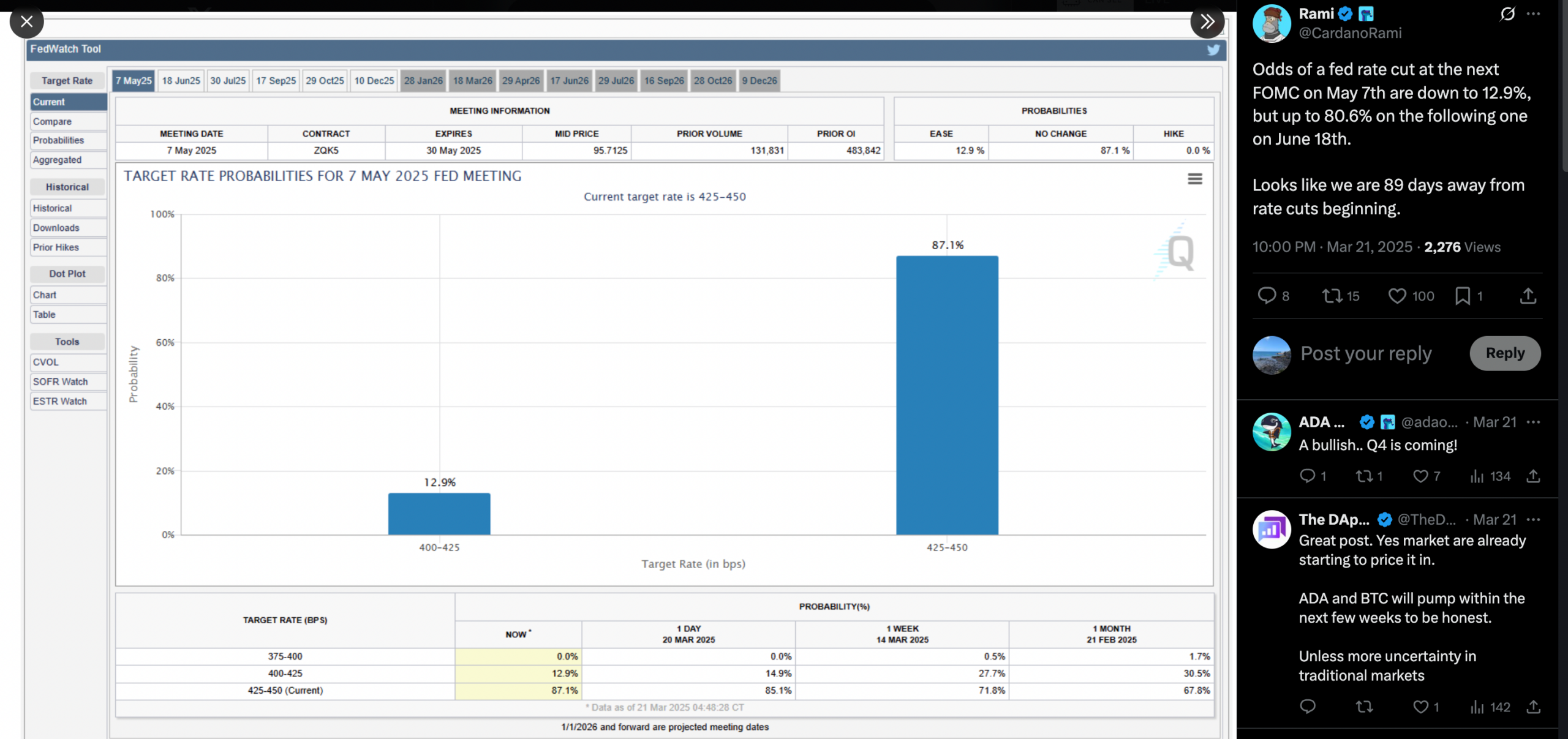 Analysts seemingly agree that fixed income markets project that a cut in interest rates in May is unlikely, expecting rates to remain at the current 4.25% to 4.5% range. Similarly, decentralized prediction market Polymarket gives roughly a 9 in 10 chance that rates are held steady.