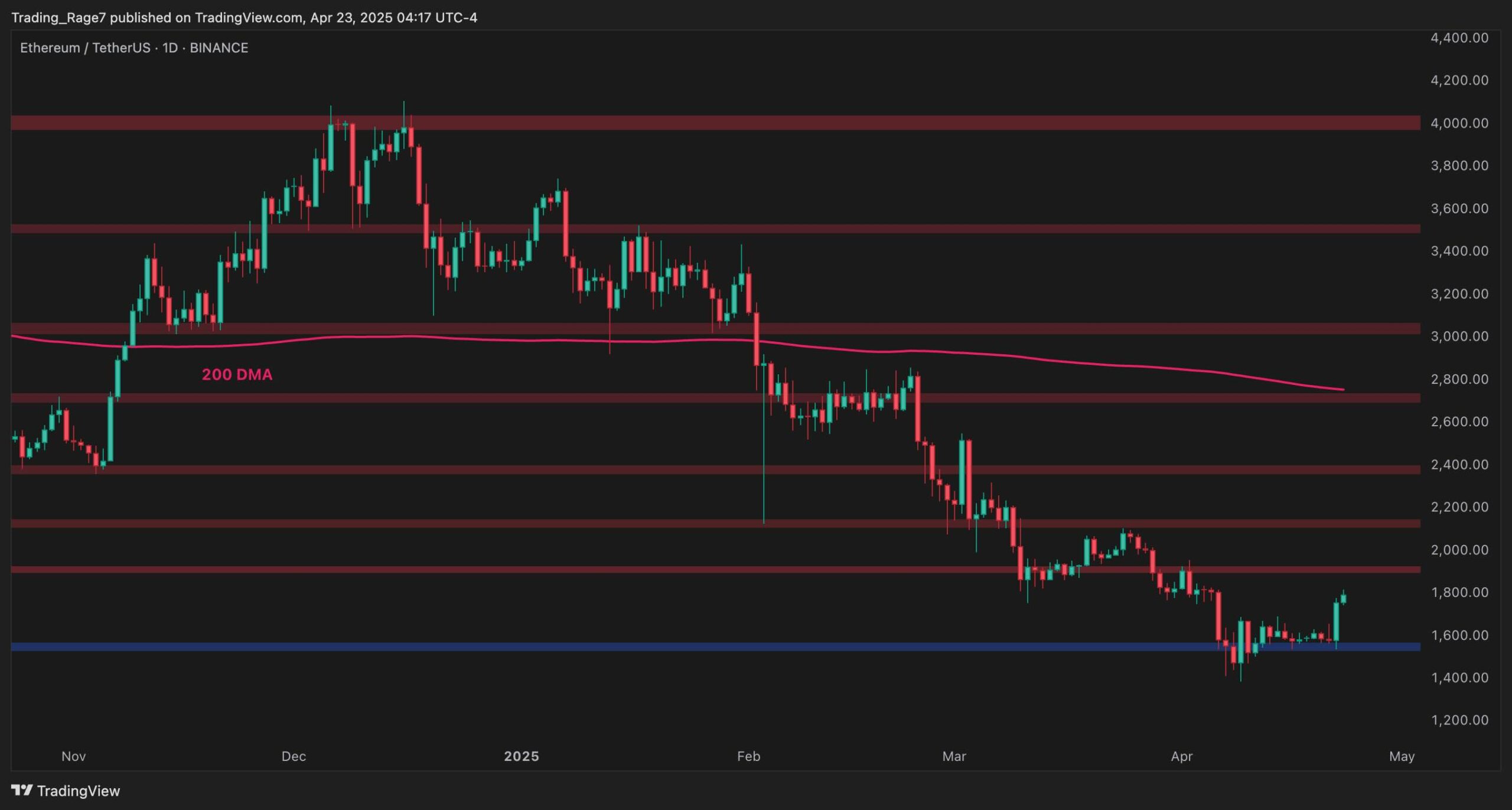 ETH’s daily structure remains bearish overall, with prices still trading well below the 200-day moving average, which is located around the $2,800 mark. However, buyers have stepped in at the critical $1,550–$1,600 support zone, leading to a clean rebound toward the $1,800 level.