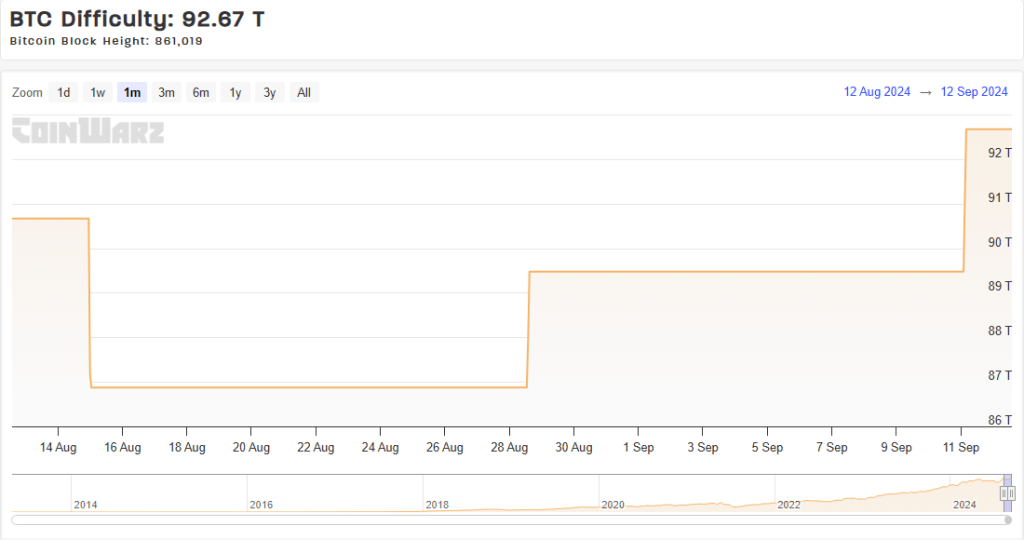The difficulty in mining Bitcoin has surged to a new record level, hence squeezing profit margins. Reaching 92.67 trillion, the difficulty index exceeded the previous record peak of 90.67 trillion set in July this year.