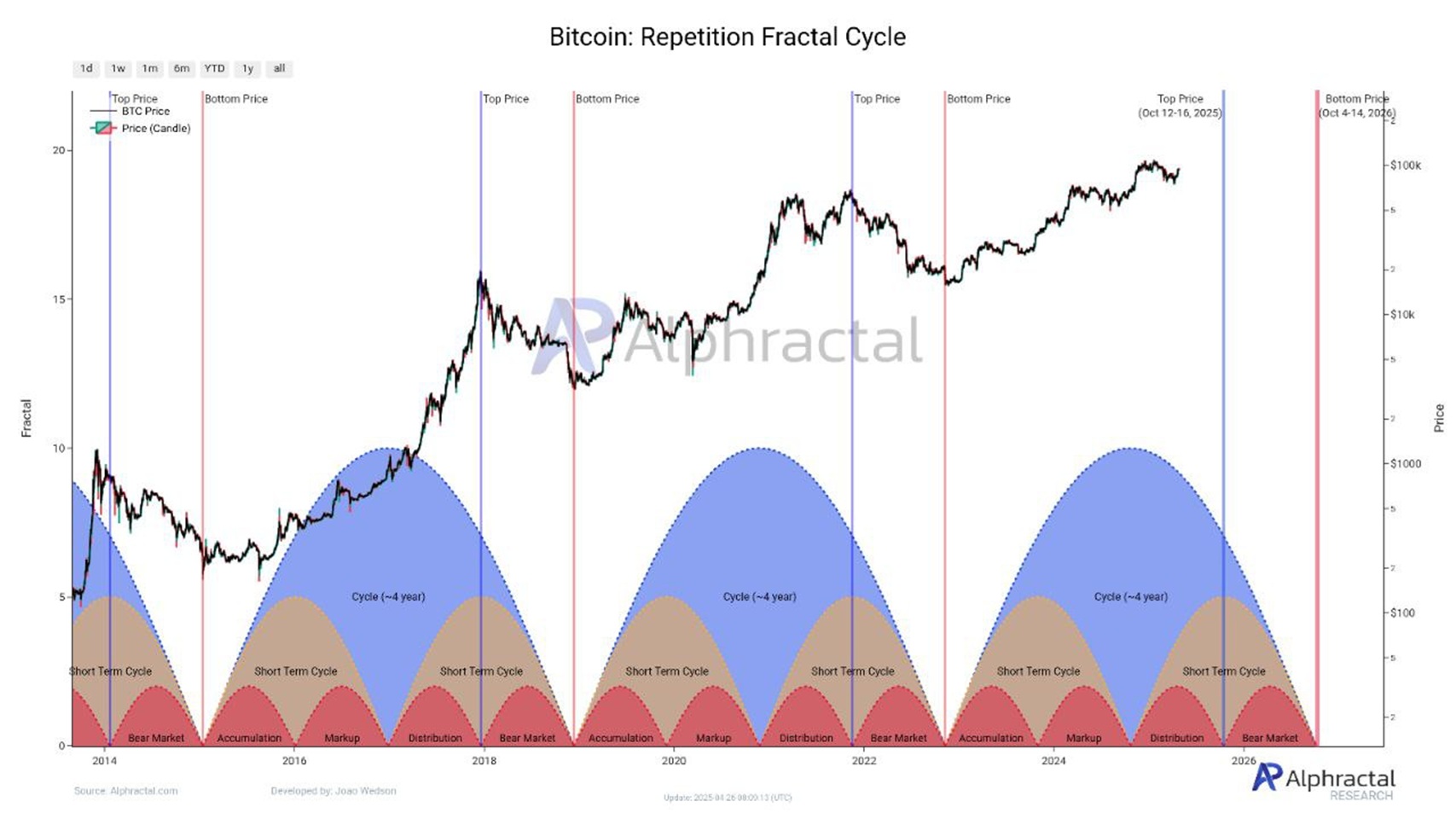 According to analysis from analyst firm Alphractal, Bitcoin’s symmetrical behavior—visible since 2015—continues to make it one of the few assets that actually moves with a rhythm. With October 2025 projected as the next major peak, the current markup phase could be a rare window for investors looking to catch the next wave.