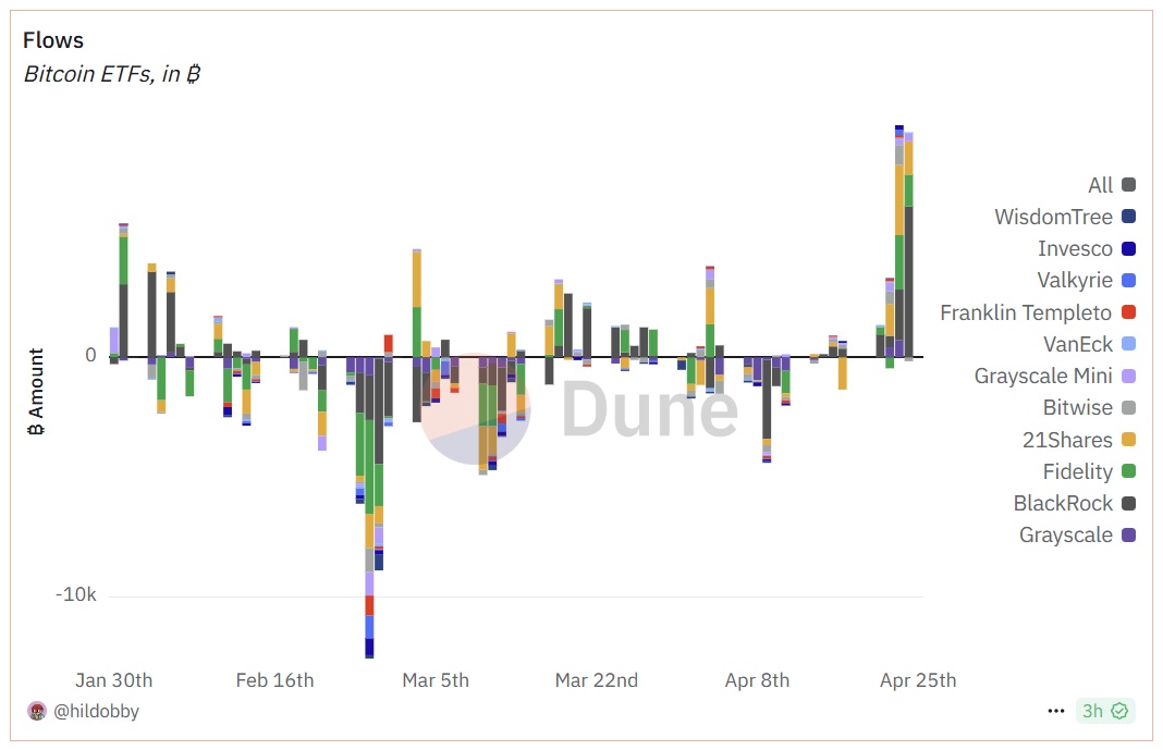 So far, Bitcoin ETF flows show big investor shifts. Grayscale saw major outflows, while BlackRock and Fidelity gained most inflows. Late April marked a strong comeback with over $500M flowing in.