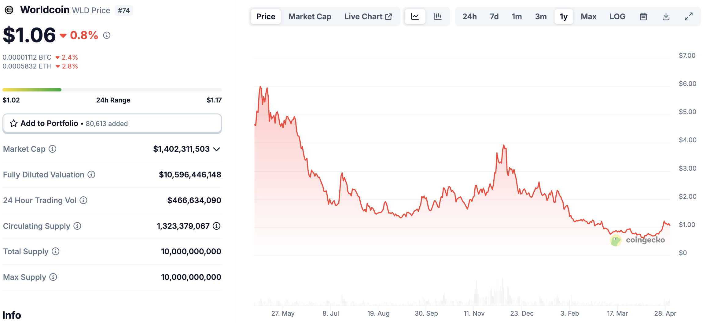 Even with Worldcoin in the news due to its US launch and Sam Altman doing the media rounds in the States to promote the project, its native WLD token is still down 1.5% today.