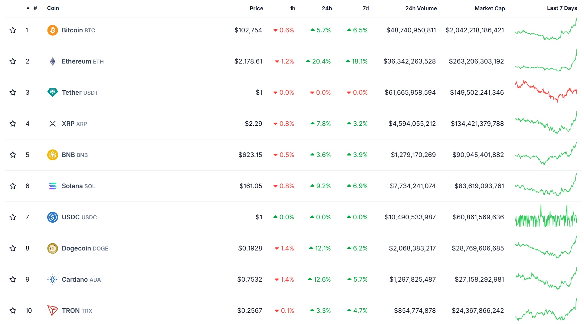 At the heart of the rally, of course, was Bitcoin. It jumped more than 5 percent, crossing the six-figure mark to hit $101,329. That’s the first time it’s topped $100,000 since February, and it didn’t get there alone. Ethereum also surged by over 14 percent to cross $2,050. Other big names like Solana, XRP, and Cardano posted strong gains too, all contributing to the $3 trillion market cap milestone.
