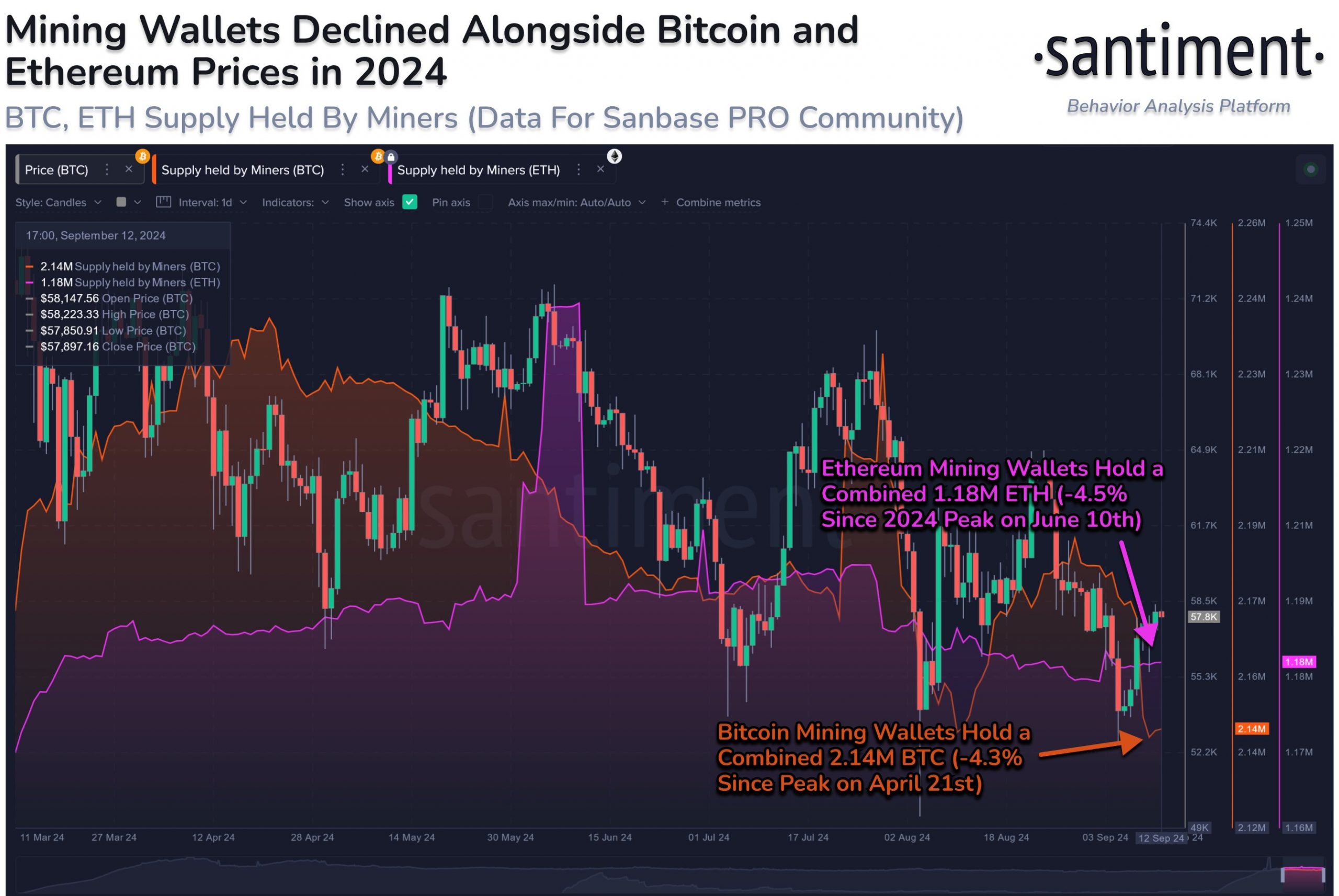 Santiment notes that a reversal in the Supply held by Miners could be one to watch, as it would suggest the miners have become comfortable enough to accumulate again and act as “a strong signal the next bull run is approaching.”
