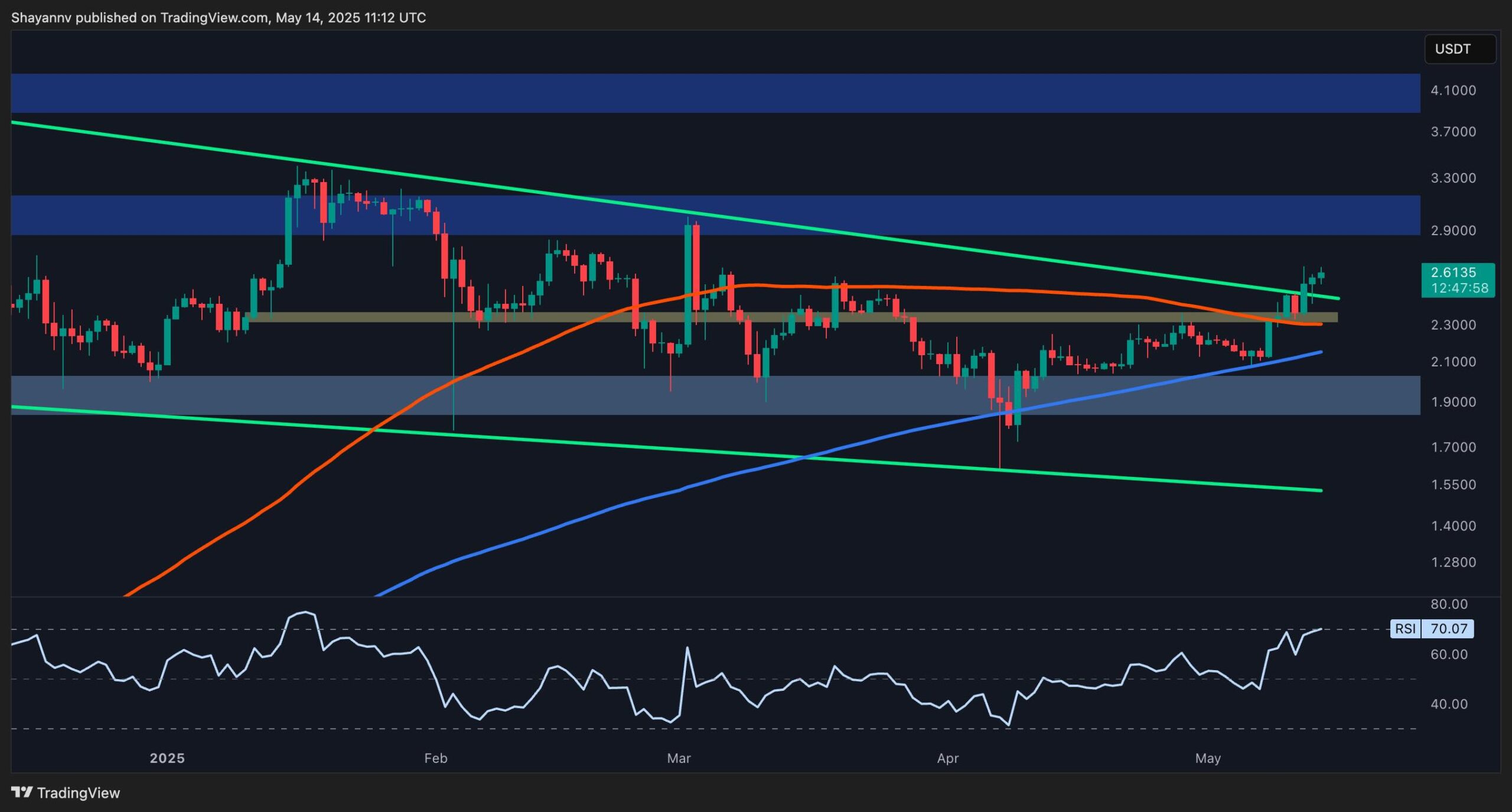 XRP/USDT has successfully broken above the falling wedge pattern that had capped price action for the last few months. The breakout was accompanied by a strong move through the $2.50 resistance zone, which now acts as short-term support. The price is currently trading above both the 100-day and 200-day moving averages, located around $2,20, and the RSI is also hovering around 70, indicating overbought conditions.