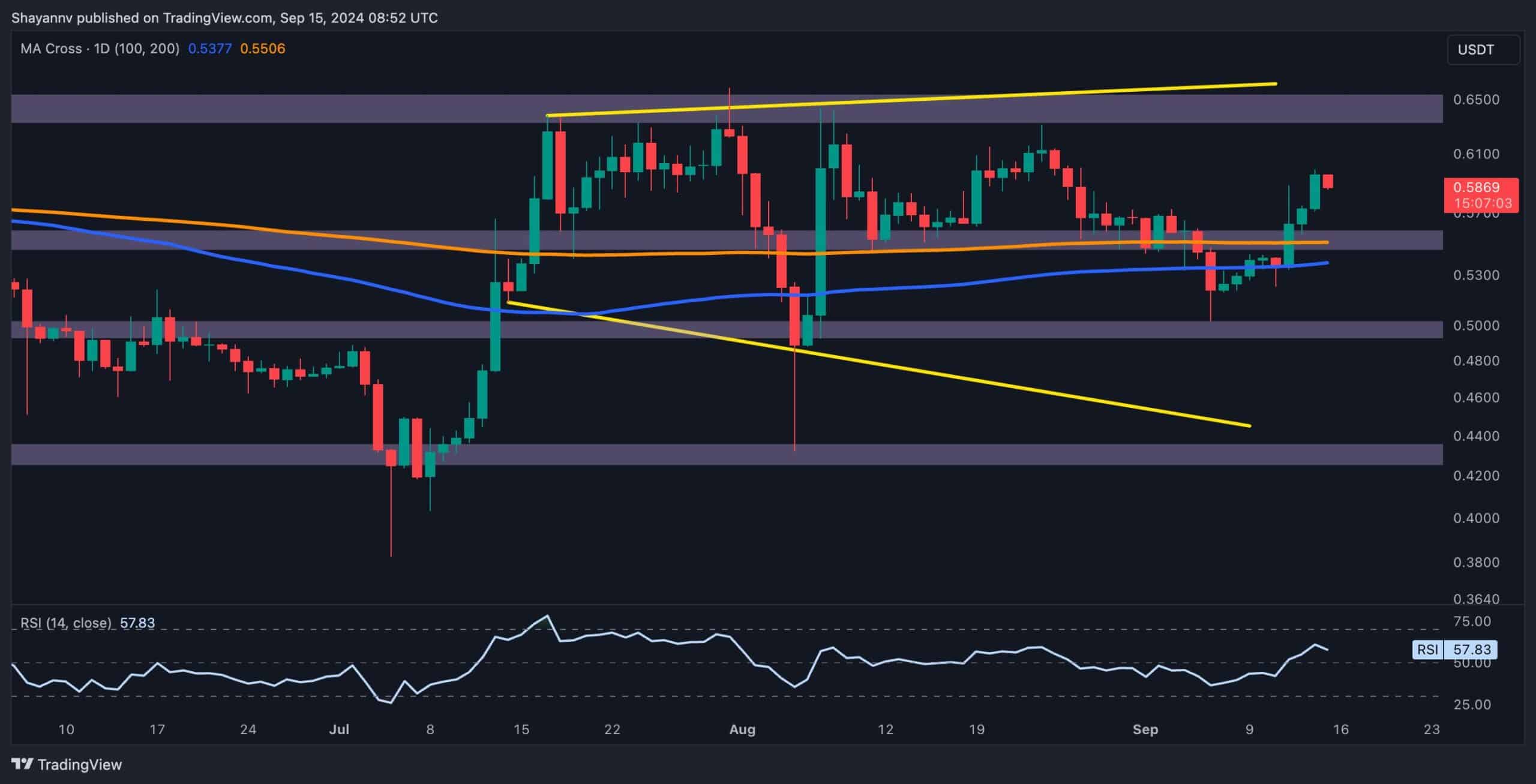 If the price breaks above $0.62, further bullish momentum is likely. Conversely, failure to overcome this resistance could result in a bearish pullback, with the price potentially falling back toward the flag’s lower trendline around the crucial $0.53 support.