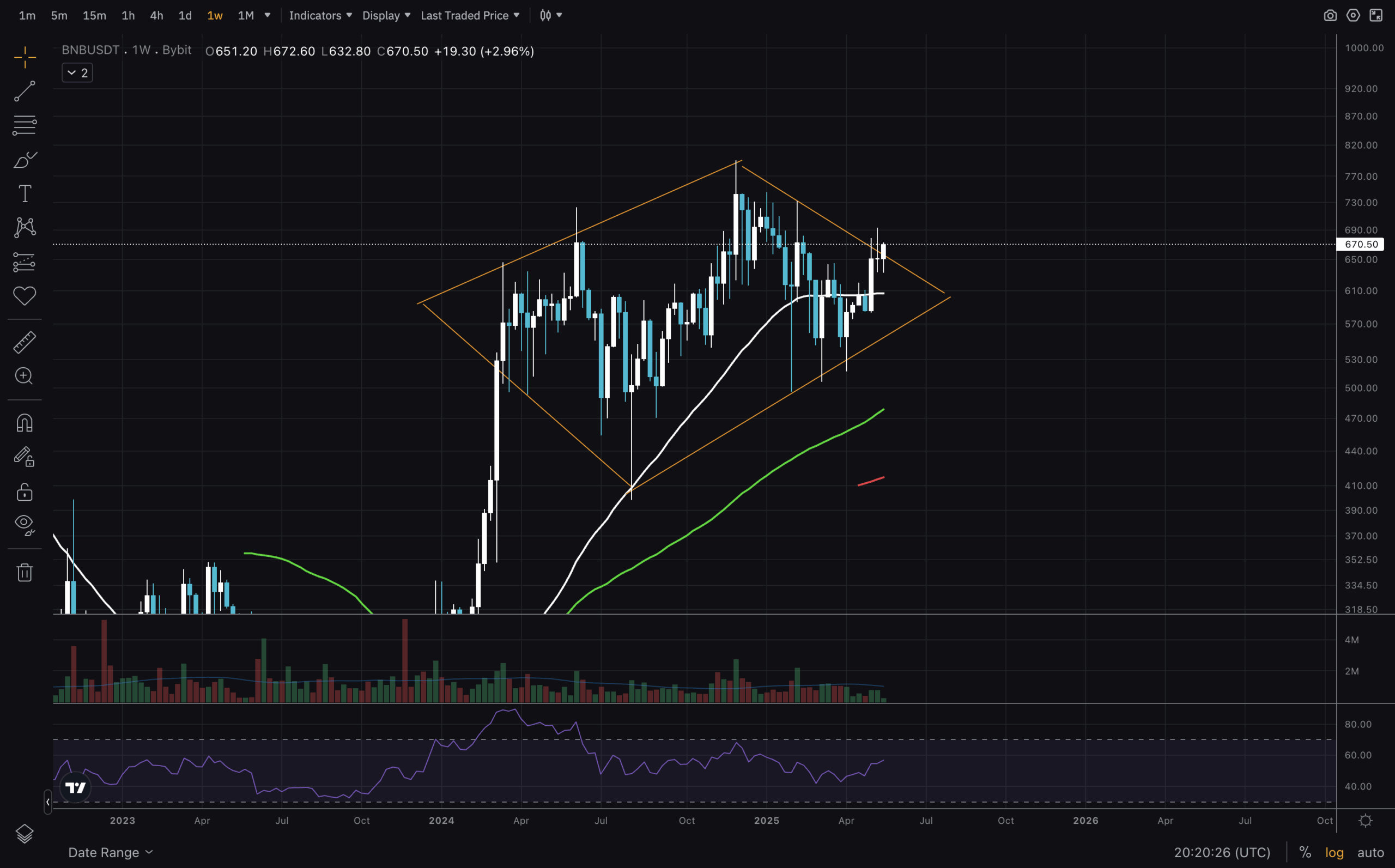 Initiating this analysis with the weekly chart again, we can see BNB pushing out upwards from this diamond(ish) shape. Often, such diamond patterns are called Diamond Top, though a clean breakout of it is the real indicator of where the price is heading. Still, it is important to keep in mind that this is a rather rare pattern, therefore, its accuracy is not as high as rectangles, for example.