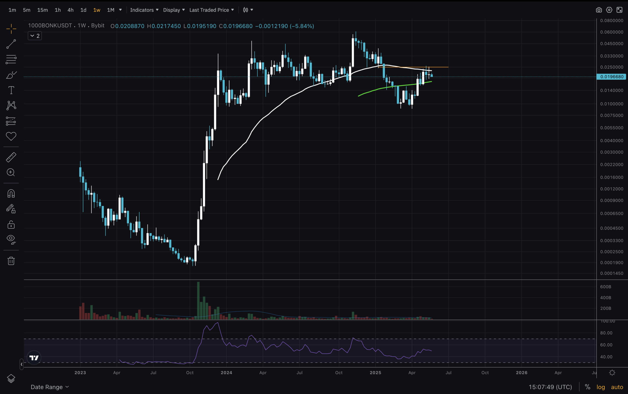 BONK chart on the Weekly timeframe. I’m using 1000BONKUSDT on Bybit for simplicity’s sake. Let’s start with simple moving averages and market structure. We see a massive run at the end of 2023.
