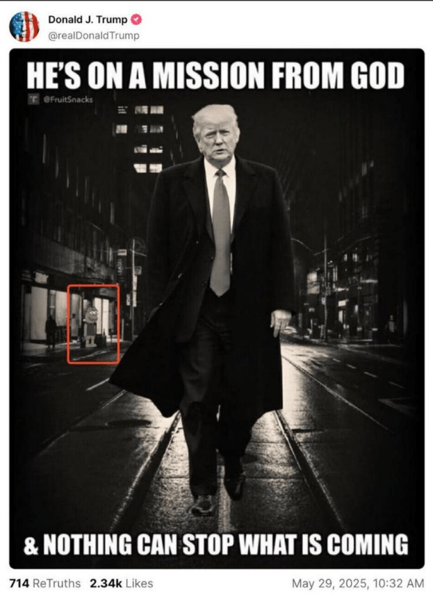 Trump’s message saying he’s “on a mission from God” makes him sound like he has a special purpose, not just a political goal. The dark street scene and the words “nothing can stop what is coming” hint that something big is coming, even if he doesn’t explain it. This kind of talk can fire up his most loyal supporters – especially PEPE aficionados – because it feels dramatic and urgent.