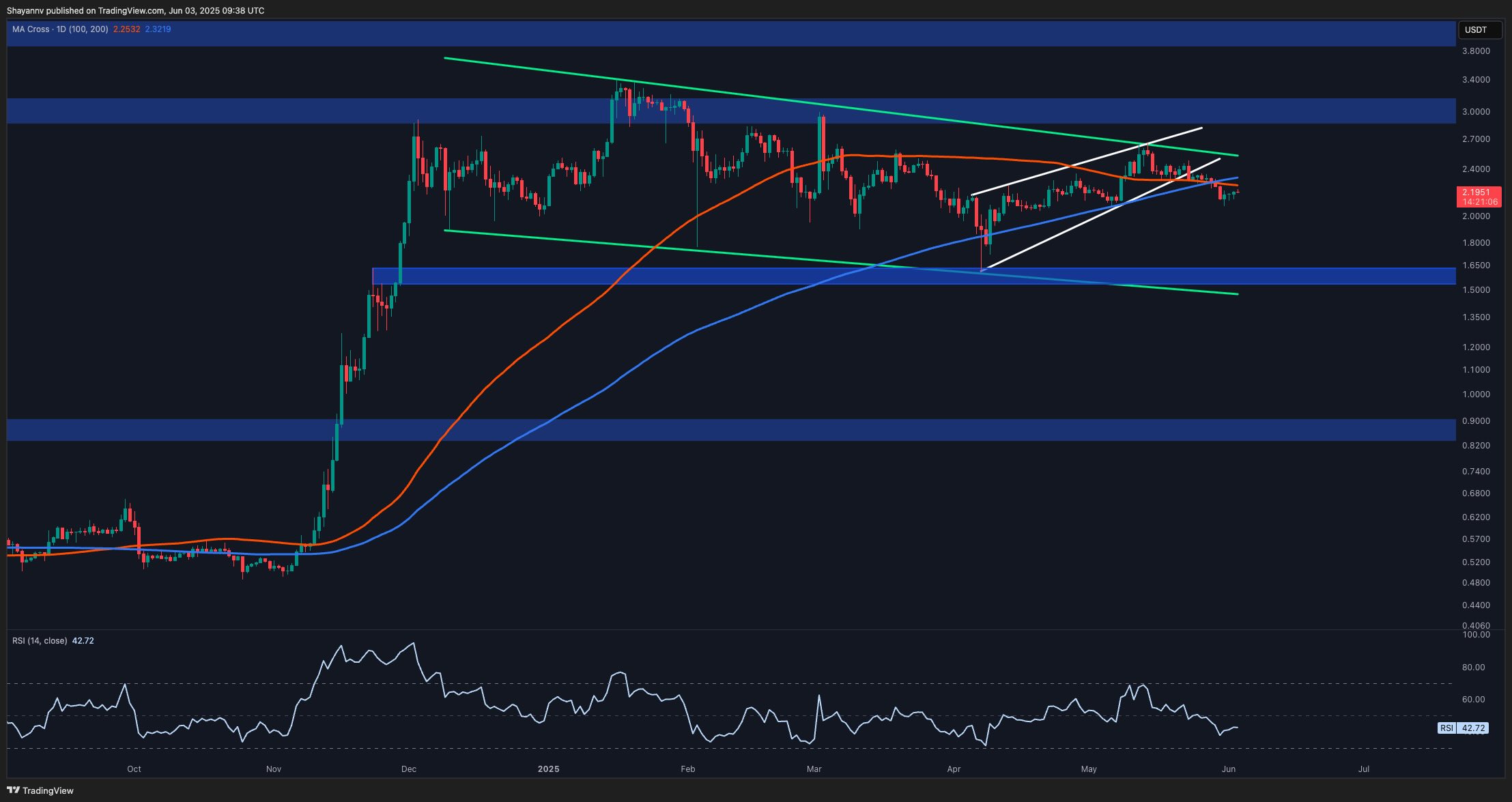 In the BTC pair, XRP has broken below the key 2,100 SAT support area with low momentum. A potential breakdown from the falling wedge pattern and the earlier rejection from both the 100-day and 200-day moving averages, located around the 2,500 SAT mark, suggests sellers are still in control. There is also no bullish divergence on RSI, which has dipped below 40, showing persistent weakness.