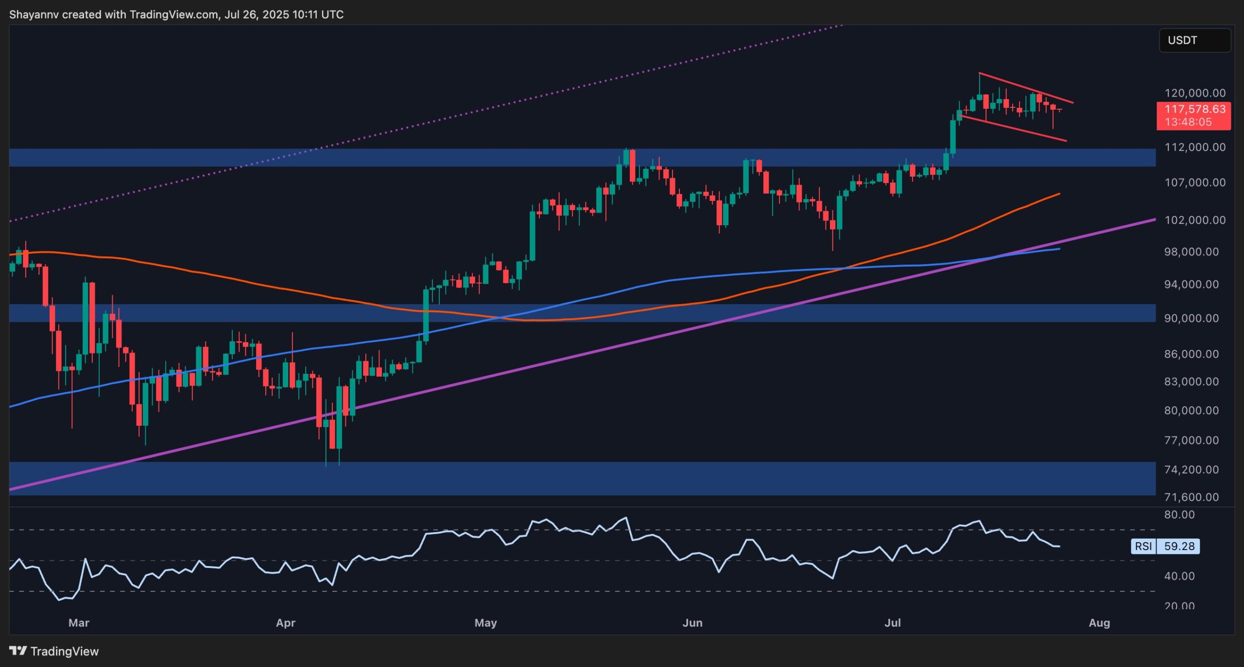 On the lower timeframe, BTC is forming a bullish flag pattern, a classic consolidation formation within an uptrend. The price has consistently printed higher highs and higher lows, supported by an ascending trendline acting as dynamic support, currently near the $114K level.