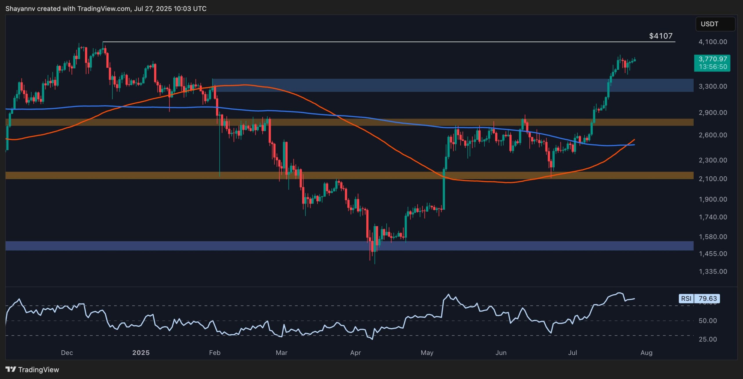 Ethereum continues to show strong momentum as the price hovers just under a key level, supported by sustained bullish structure and growing market interest. With spot prices holding above major moving averages and an aggressive rally from June lows, all eyes are on whether ETH can break above the $4,107 level.