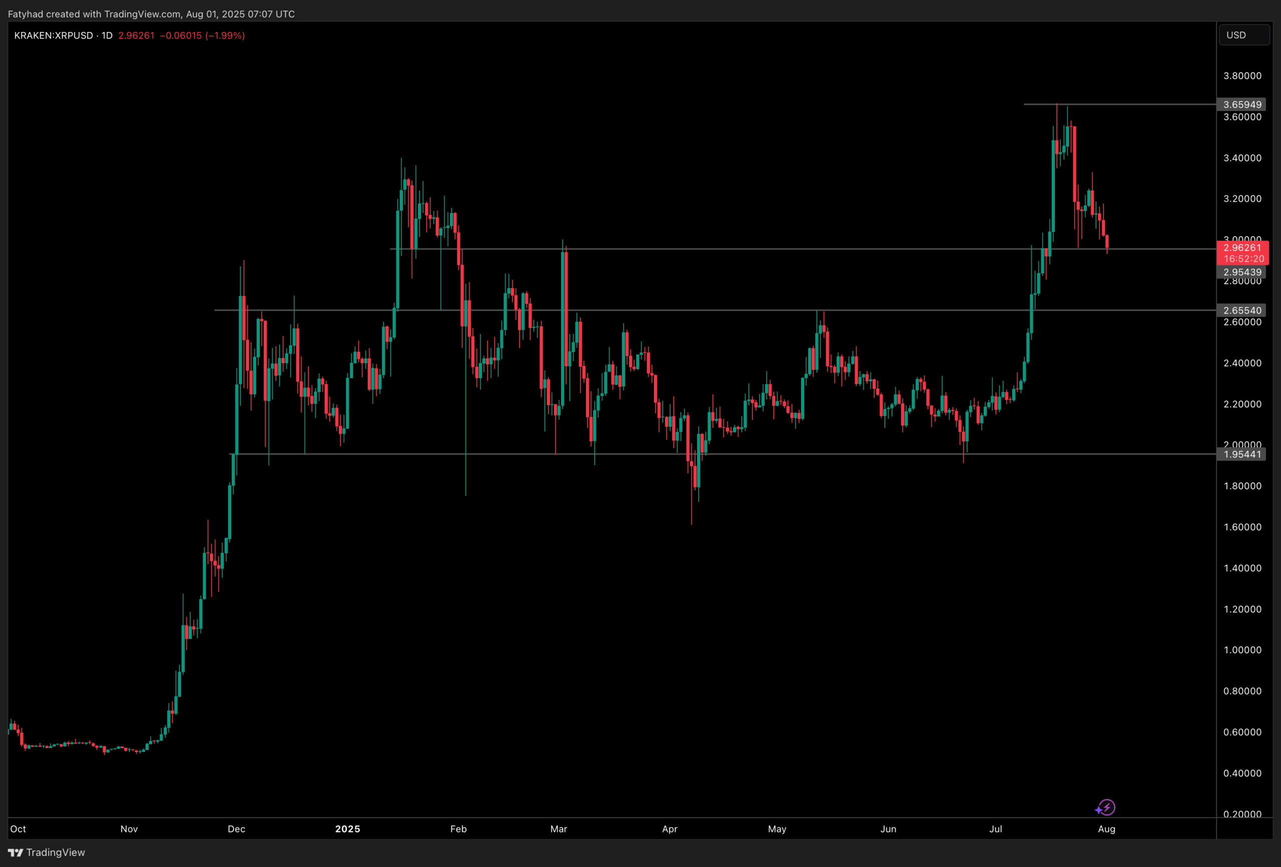 At the same time, XRP price is retesting a key support zone around $2.95. After peaking near $3.66, XRP has pulled back to this horizontal level first tested in March and May. If buyers defend $2.95, XRP could rally back toward $3.20 or higher. But a break below might send price down to the next floor near $2.65.
