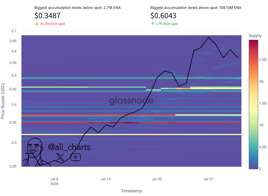 Notably, a price crash to the $0.35 support zone indicates a potential estimated 37.5% loss from current prices. Meanwhile, the CBD model also reveals that ENA’s next price resistance sits around the $0.60, at which lies the next immediate cluster above the spot price.