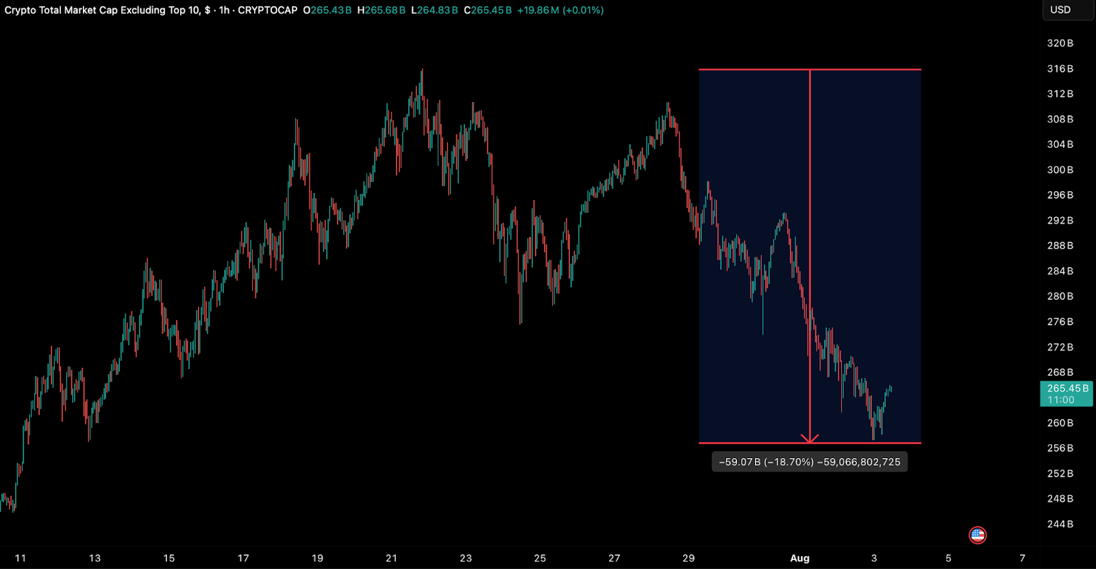 Bitcoin has decisively broken below its local range support at $115,800 after multiple retests over the past three weeks, hitting a low of $112,210. This breakdown coincides with a broader de-risking across the crypto complex, particularly in altcoins, where leverage had been aggressively building. The OTHERS index—representing the broader altcoin market, but excluding the top 10 coins by market capitalisation, has suffered an 18.7 percent drawdown over the past 10 days, erasing nearly $59 billion in market cap before rebounding on Sunday.