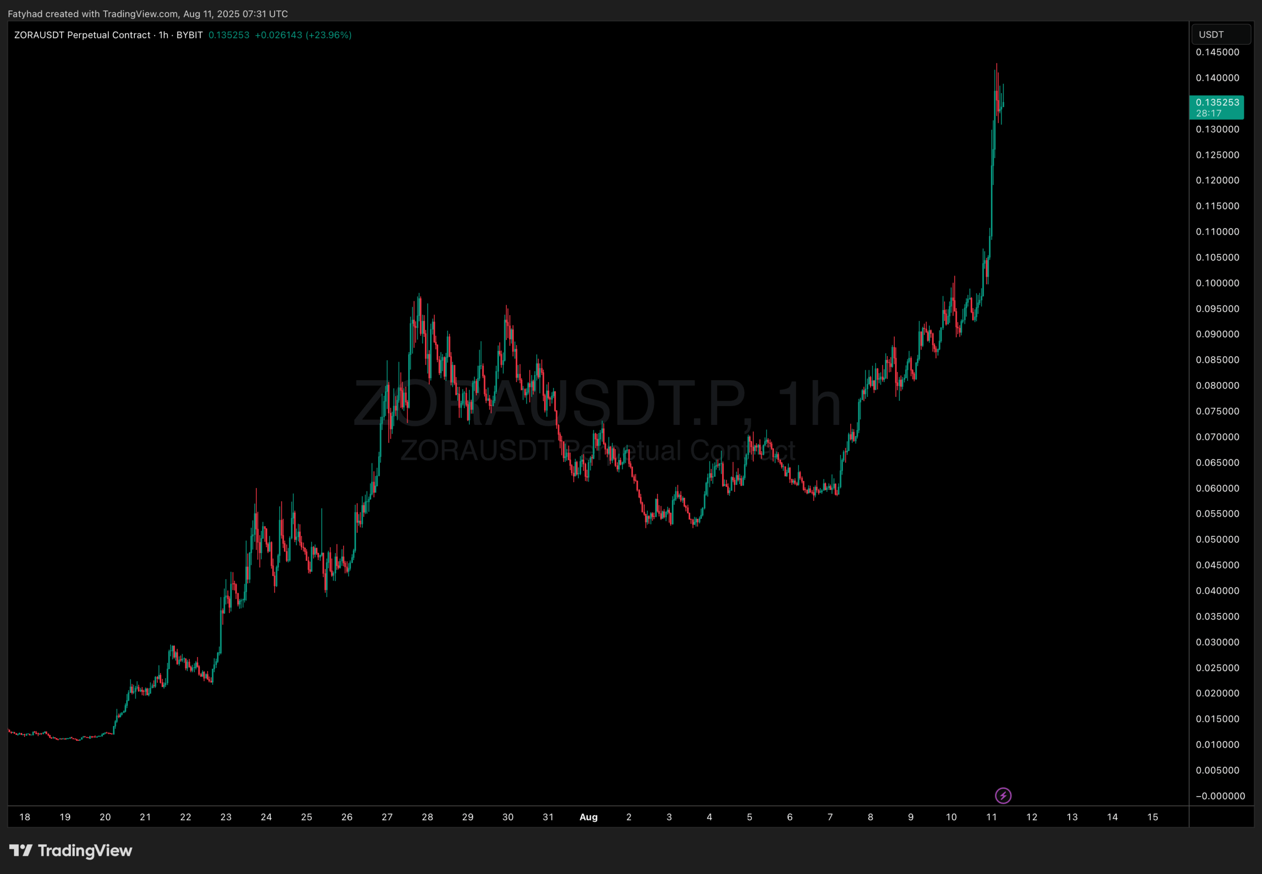 ZORA has been in a strong uptrend, breaking above $0.13. The move represents a gain of nearly 45% in the last 24 hours, with momentum accelerating over the past two days. Immediate resistance is near $0.14, while short-term support is around $0.11–$0.12.