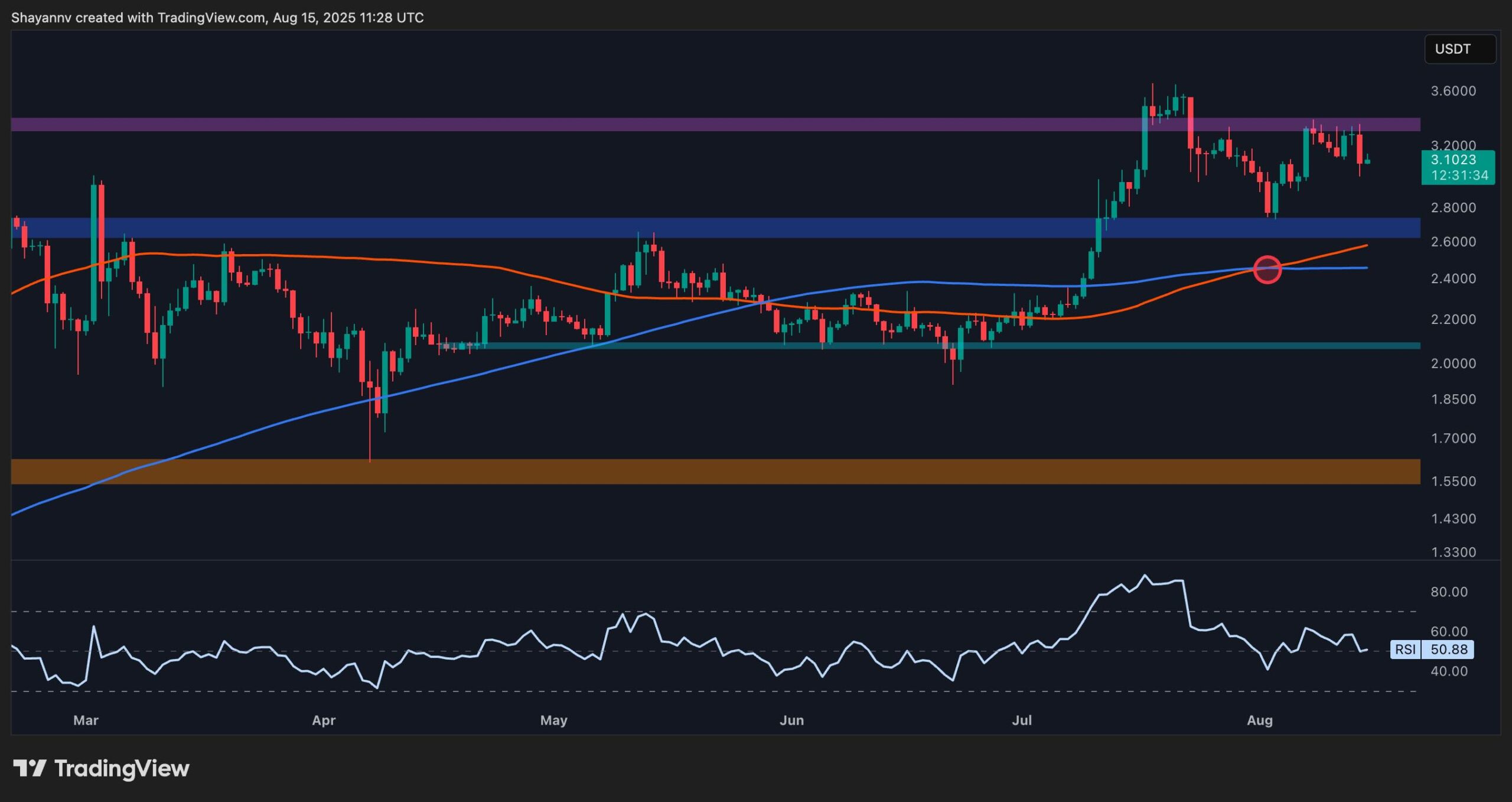 However, the RSI hovering near the neutral 50 level suggests a lack of strong momentum for now, meaning a short-term pullback into the $2.80 support zone is still possible.