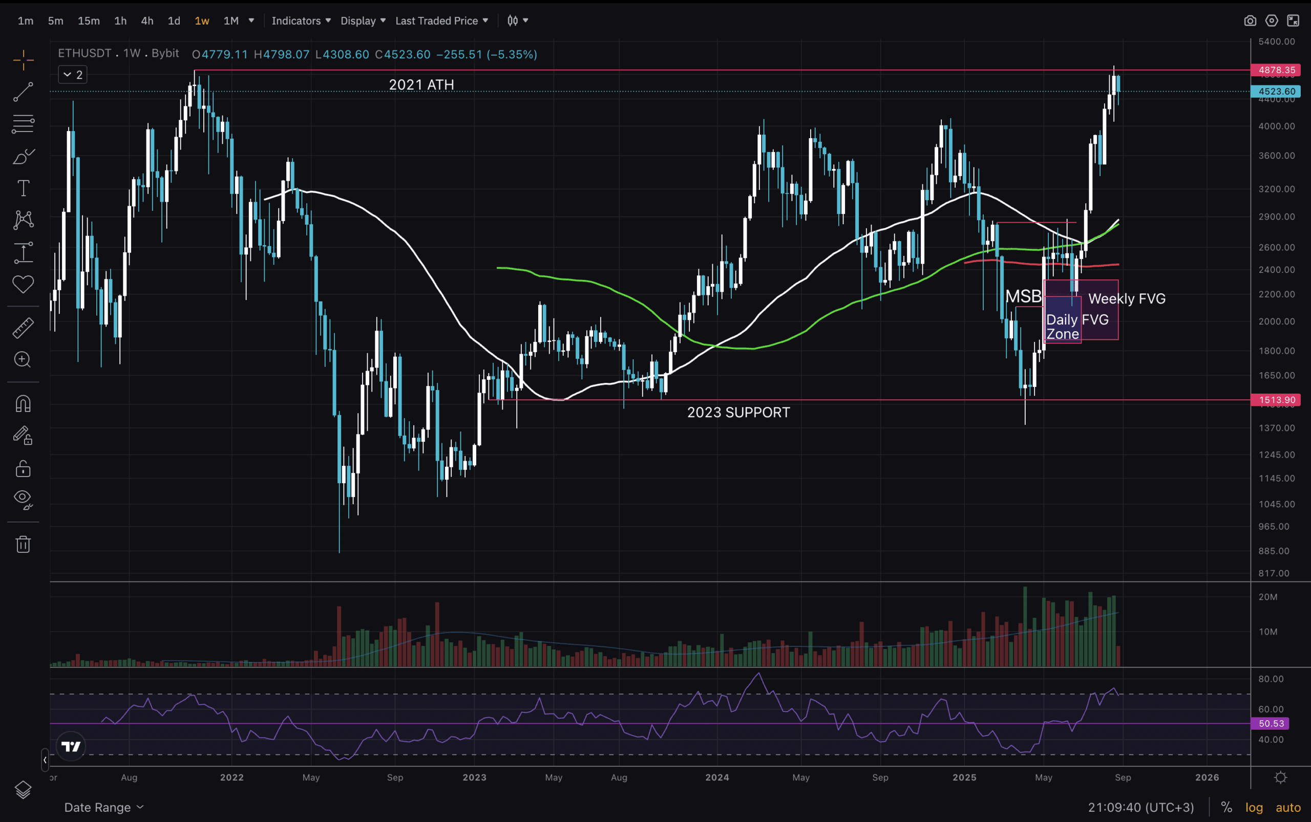 Moving onto the 1D chart, we see clearly the MSB from May, filling of both FVG gaps in June, and a strong explosive move to the upside in July and August. One thing that catches the eye here is weakness in RSI, though the 50 level is holding well at this point. It would not be surprising to see a deviation below the 50 points. We have retested the $4878 ATH from 2021 and even wicked to a new one at $4957.