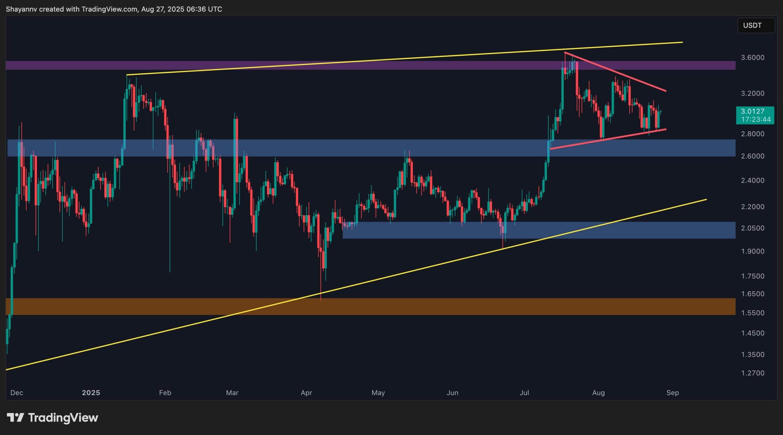 Ripple’s native cryptocurrency is currently consolidating within a triangle structure, with the $3.3 resistance acting as the key barrier for bullish continuation and $2.8 support serving as the critical floor.