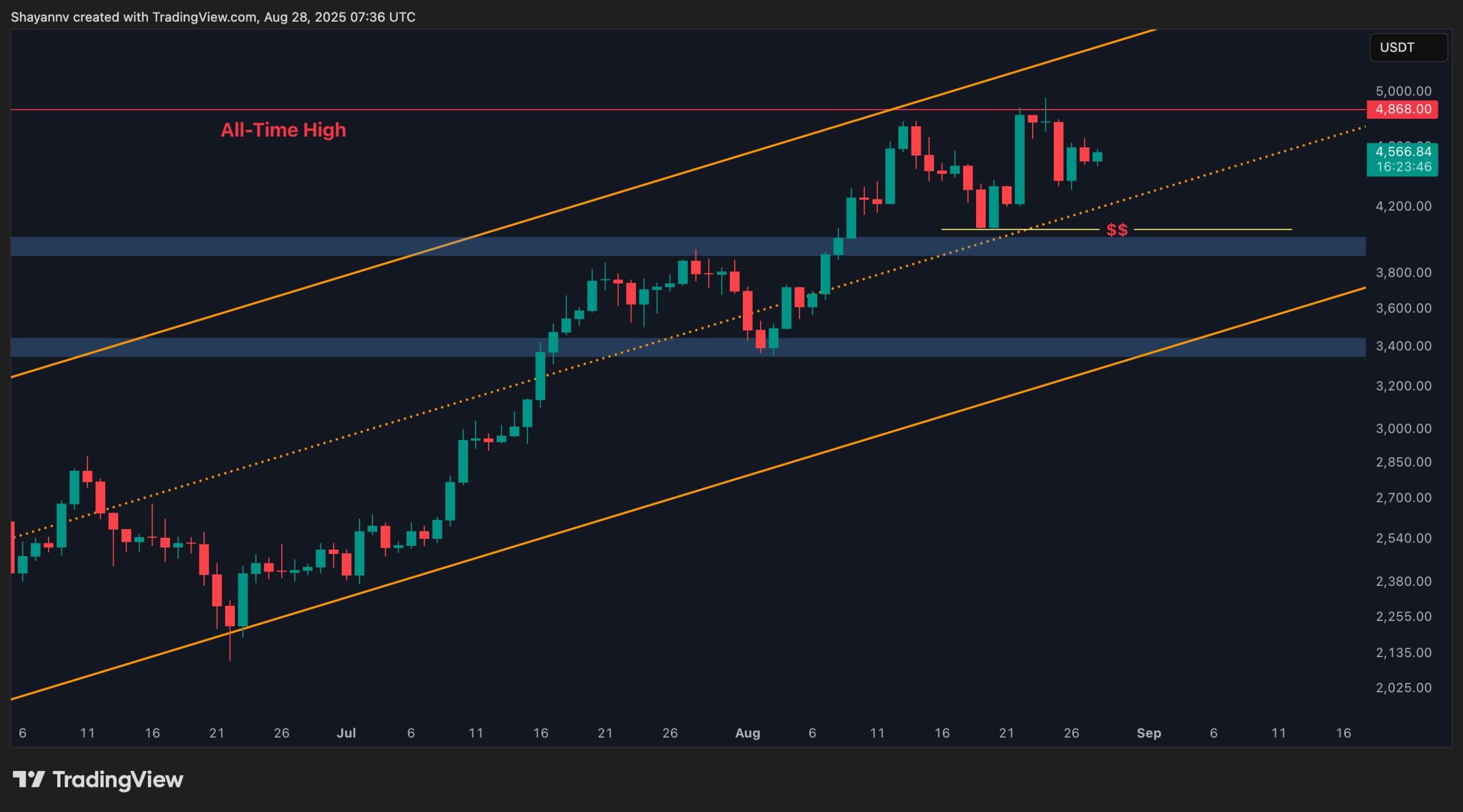 On the 4-hour timeframe, ETH is consolidating between $4.4K support and $4.9K resistance, forming a tight range after its recent rejection at the ATH. The ascending trendline from mid-August continues to provide near-term support, keeping the short-term structure tilted bullish.