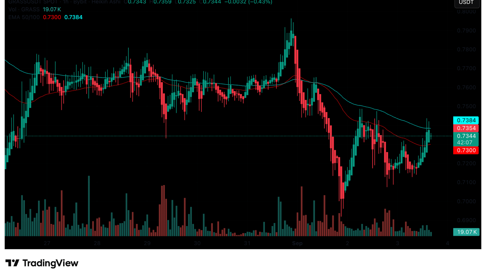 Data from TradingView shows the GRASS price is trading at $0.7344, marking a slight drop of -0.43% during the session.