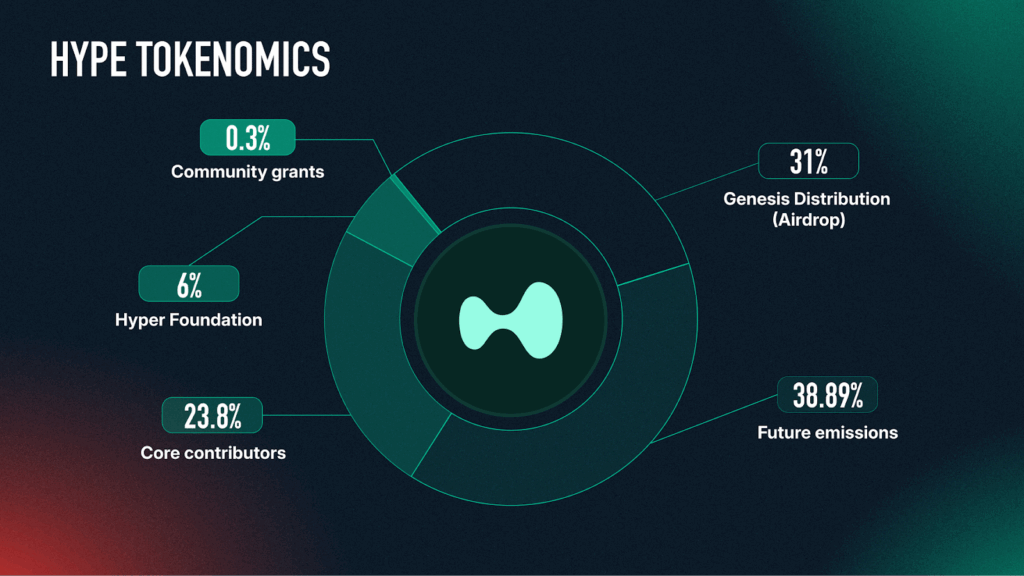 HYPE was launched via a substantial community-focused airdrop in late 2024, with 31% of the total 1 billion supply distributed to early users, making it one of the largest DeFi airdrops to date. The remaining supply is allocated across future emissions (38.888%), core contributors (23.8%), Hyper Foundation (6%), and community grants (0.3%). As of March 2025, HYPE had achieved a market capitalization exceeding $4.4 billion, with roughly 333 million tokens in circulation.