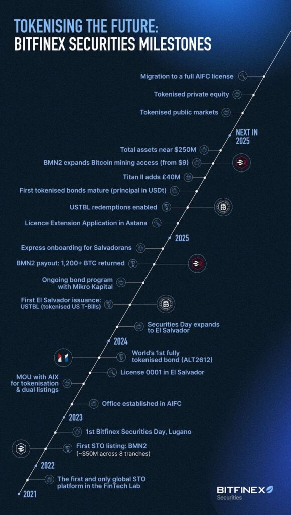 The announcements and engagements at Astana Finance Days mark an important milestone for Bitfinex Securities, showcasing both its operational growth and its commitment to building a compliant, regulated presence within global financial markets. By advancing toward a full AIFC licence and surpassing $250 million in AUM, the company has demonstrated that tokenised securities are moving from theory to practice, gaining traction as a serious component of modern finance. The discussions led by Jesse Knutson, and the Bitfinex Securities team, and the networking event further reinforced the Bitfinex Securities’ role as a bridge between innovation and institutional adoption.