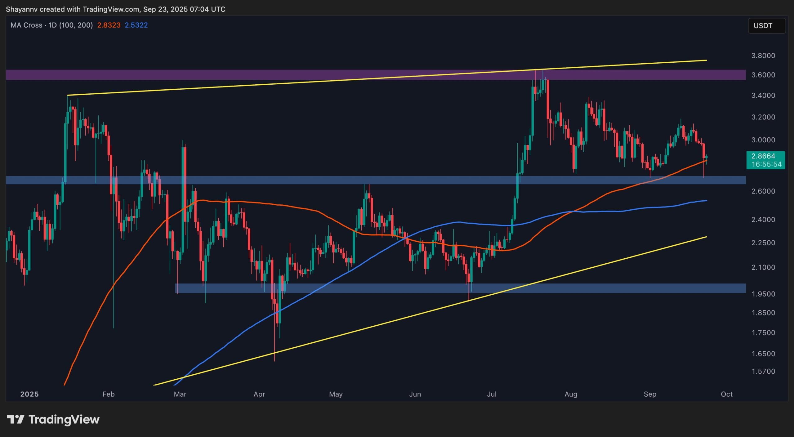 On the daily timeframe, XRP has retested its 100-day moving average following the recent sell-off. The decline from the mid-range resistance drove the asset toward the $2.85 zone, where horizontal support converges with the MA. This overlap makes the current level a critical battleground.